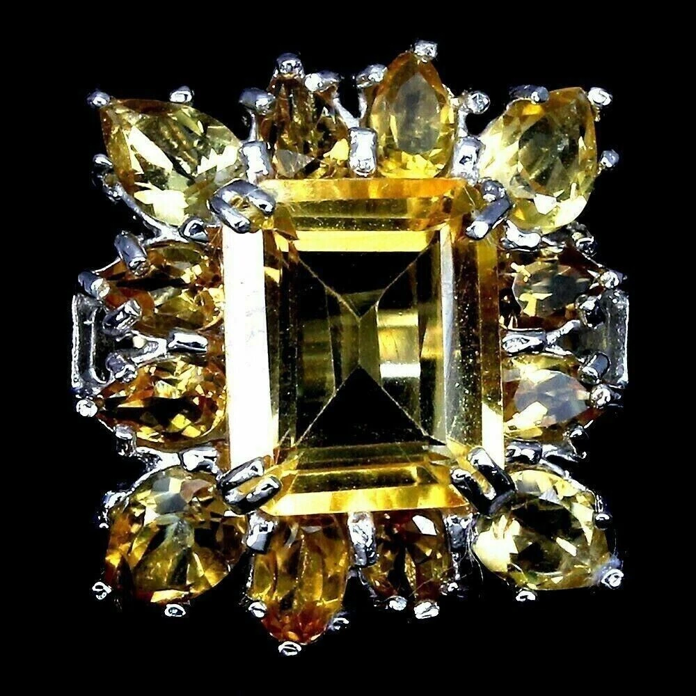 Solid sterling silver 925 stamped white gold coated ring which features octagon and pear cut faceted genuine natural mined golden citrine gemstones each measuring from 5mm x 3mm to 11mm x 9mm set into a cluster design. The ring measures 21mm x 19 m m and it is a size R 1/2 (US 9). GIFT BOXED Thanks for looking and please take time to view my other listings #11211