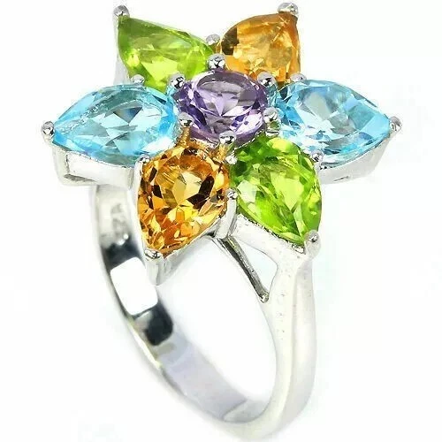 Solid sterling silver 925 stamped white gold coated ring featuring a central genuine natural mined round cut faceted purple amethyst gemstone measuring 5mm x 5mm surrounded by genuine natural mined pear cut faceted 7mm x 5mm green peridot, golden citrine and heated blue topaz gemstones. The face of the ring measures 20mm x 20mm and it is a size O (US 7.25). GIFT BOXED Thanks for looking and please take time to view my other listings #4796