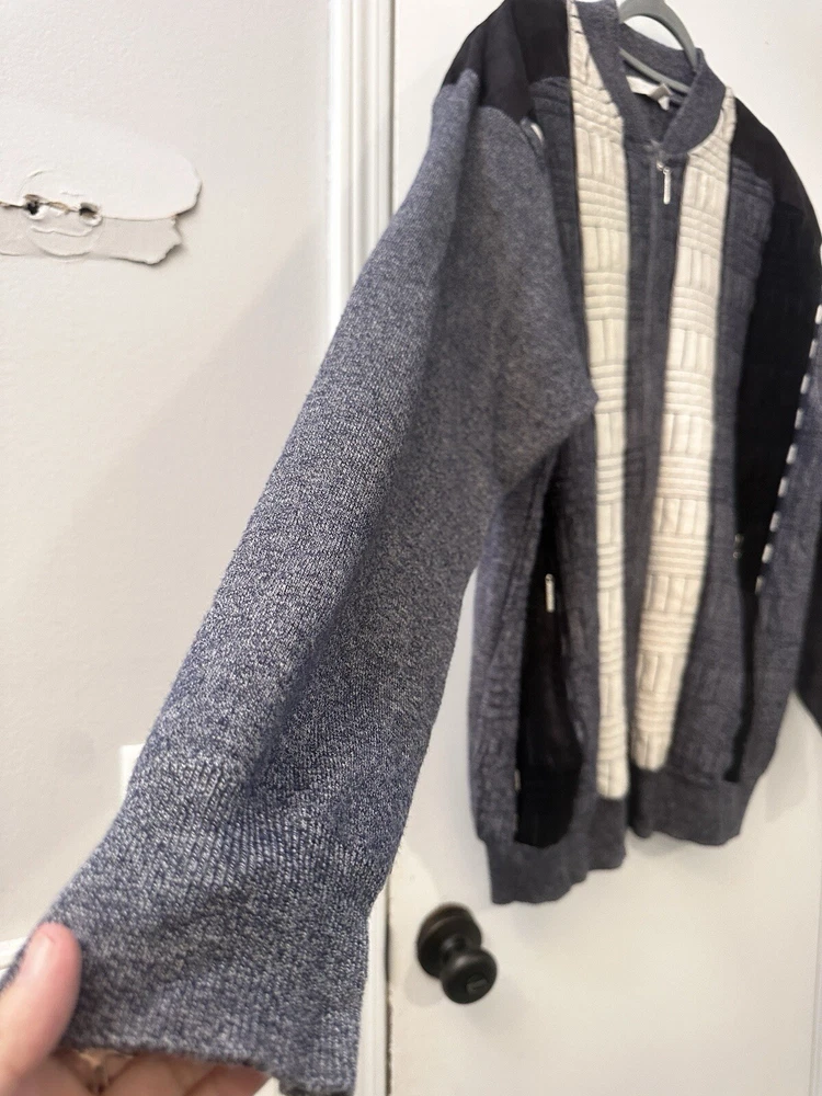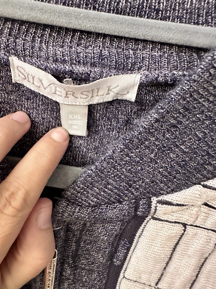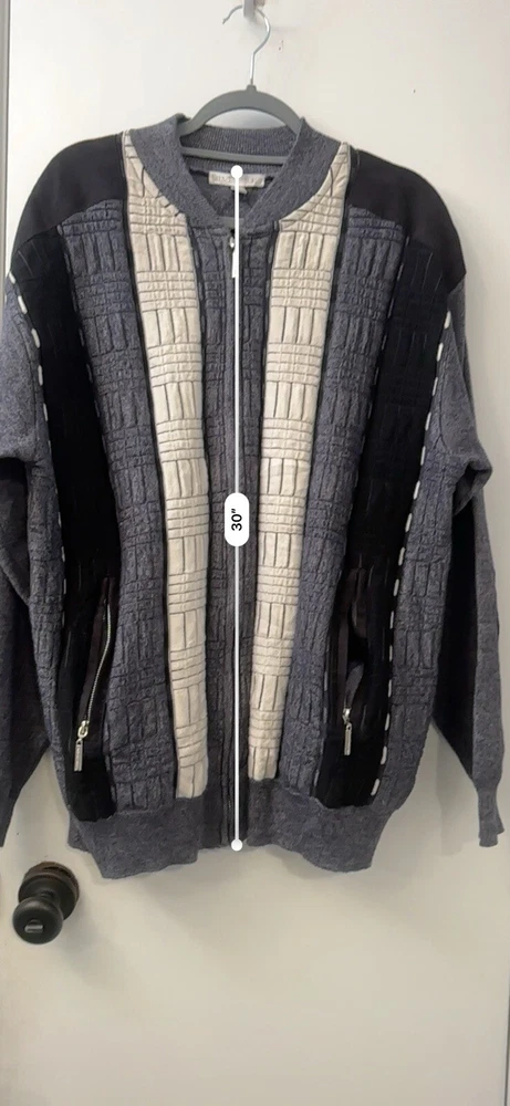 This rare Silver Silk men’s vintage jacket, size XXL, features an iconic patchwork knit design with contrasting fabric panels in black, beige, and grey, offering a bold and stylish look reminiscent of the 80s and 90s fashion. The jacket is complete with trendy elbow patches and a zip-up front, giving it a timeless appeal for those who love retro streetwear or unique statement pieces. Crafted from a comfortable blend of rayon and acrylic, this jacket is perfect for layering in the cooler months. Whether you’re looking to add a vintage touch to your wardrobe or stand out with a one-of-a-kind piece, this Silver Silk jacket is a must-have. Keywords: #VintageFashion, #PatchworkJacket, #ElbowPatches, #RetroStyle, #80sFashion, #Menswear, #UniqueStyle, #Streetwear, #statementpiece bold, textured sweaters and jackets, sometimes with intricate patterns and designs, making it a sought-after brand for vintage enthusiasts today.
