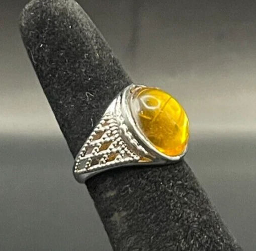 Silver Tone Amber Yellow Rhinestone Ring - Size 4