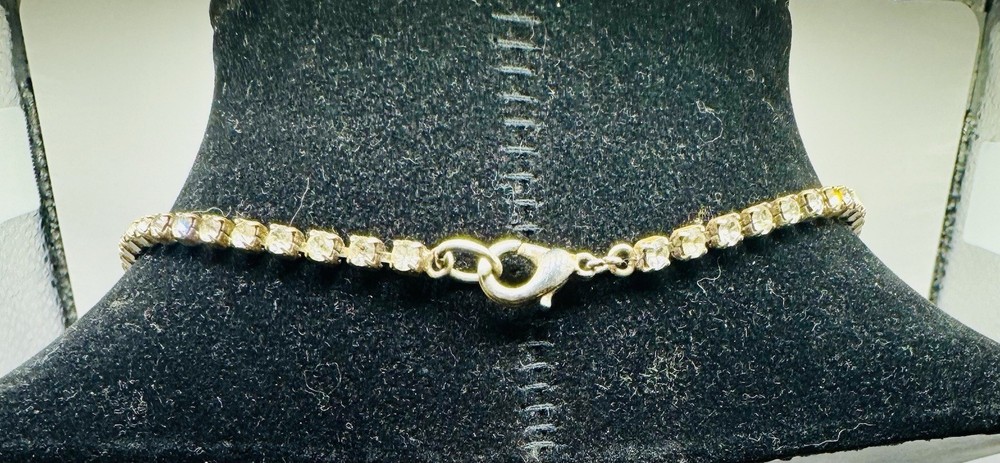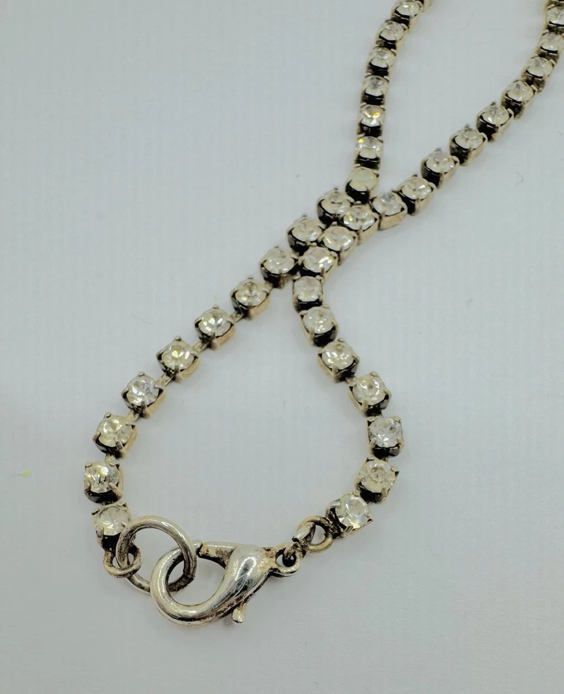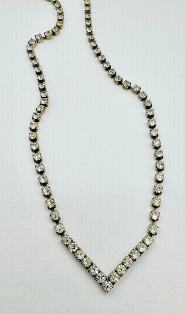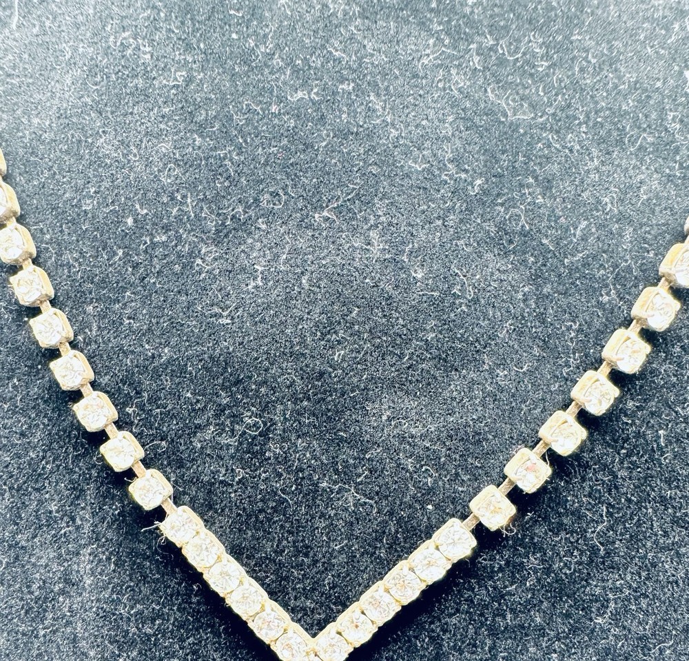 Modern Necklace with Clear Rhinestones that are Prong Set Stone. Silver Tone. “V” Shape In Front. Measures 16” but V hangs lower. Great condition showing no wear. Brilliant stones. Made well. Combined shipping available with multiple purchases. Mailed USPS Ground Advantage. (C-486)
