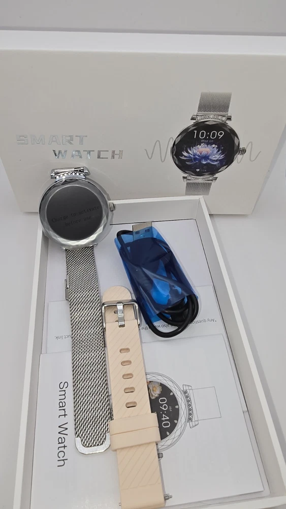 Timeless style meets smart technology. This sleek silver women’s smartwatch combines a classic metal design with modern features that keep you connected and in control. The vibrant display, smooth stainless steel band, and slim profile make it a perfect match for both everyday wear and special occasions. Stay in touch with Bluetooth calling, track your heart rate, monitor your sleep, and check the weather – all from your wrist. Elegant, functional, and ready to go. Highlights: – Polished silver stainless steel case & strap – Bluetooth call, message & app notifications – Heart rate & sleep monitoring – Step counter, sport modes, weather info – Extra strap included – USB magnetic charging – Compatible with Android & iOS – Easy-to-use interface, great battery life New, unused, ships fast. A perfect gift or stylish upgrade.