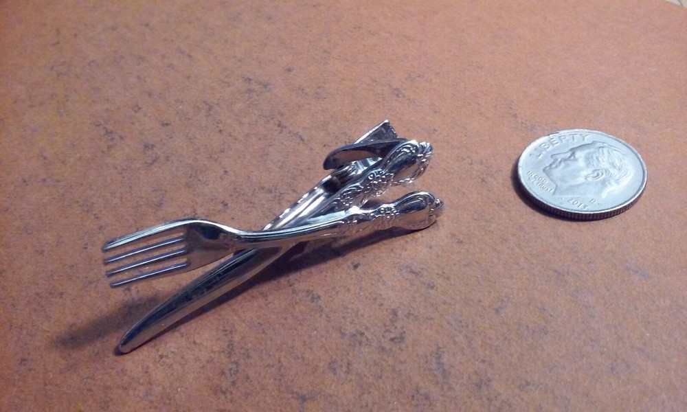 Fork & Knife Theme Utensils Restaurant Tie Clip Bar Silver-Tone Metal 2" Long, very realistic miniature clip.