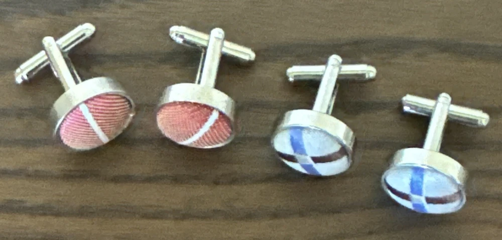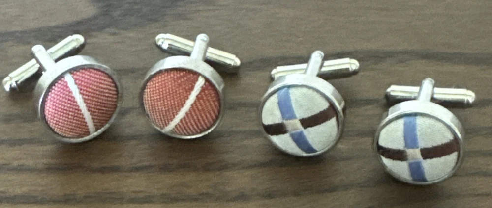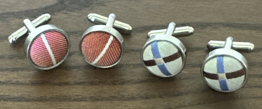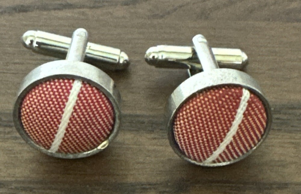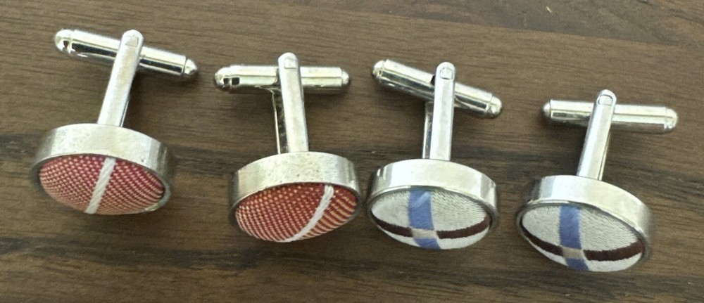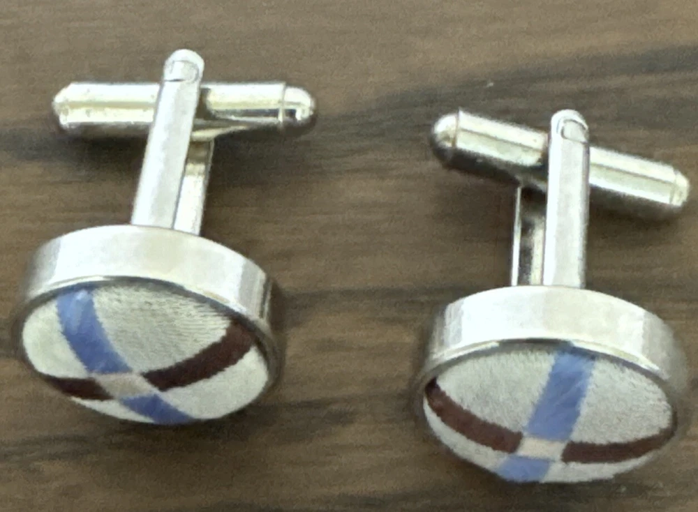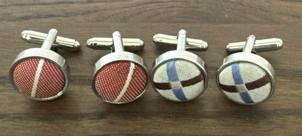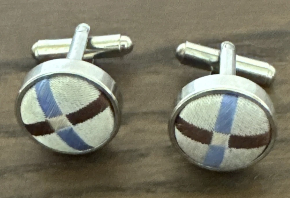 Add a touch of sophistication to your formal attire with this pair of fabric covered cut links Crafted with high-quality materials, these cufflinks are durable and long-lasting. The intricate fabric detailing make them a unique and stylish accessory. They are suitable for men and make a great addition to any jewellery collection. Good condition see pics