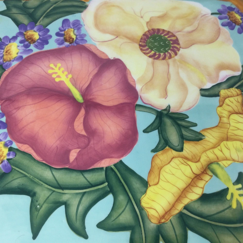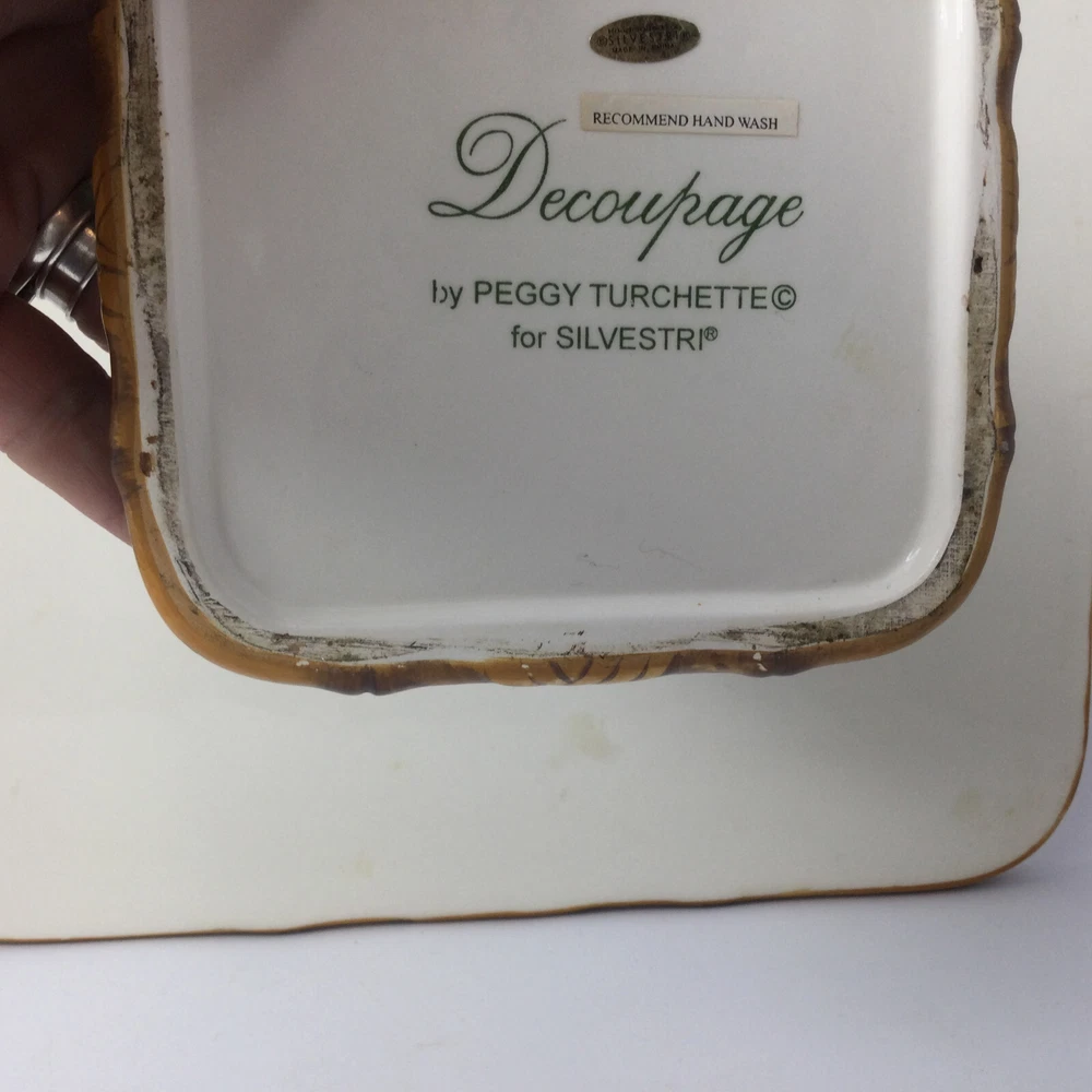 Silverstri Decoupage Square Heavy Ceramic Cake Stand Footed Flowers Butterfly. Very good condition. No damage.Painted by Peggy Turchette for Silvestri. 5.5" H x 12" W x 12" D. InvN/GS/8