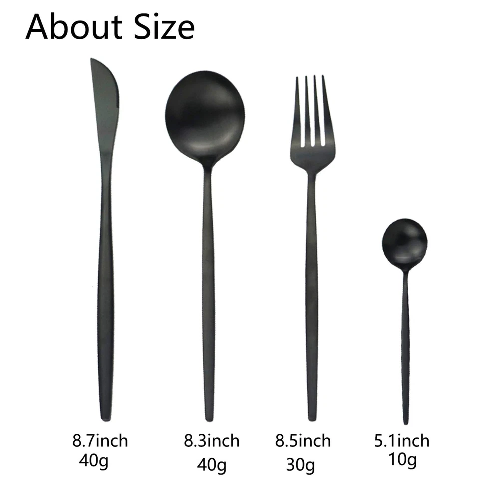 !!Superior Design --Smooth surface and satin polish makes these tableware sets always keep shining,simple classic modern design would match well with your existing cutlery and elevate everyday meals into a fine dining experience !!Craft -- Flatware crafted from 18/0 Stainless Steel,matte finish, completed electroplated with titanium, rust proof, high hardness, Lead-free, Cadmium-free, Phthalate-free, BPA-free durable and eco-friendly !!24 Pieces Flatware Set -- 6* Dinner Knife, 6* Dinner Spoon, 6* Dinner Fork, 6* Teaspoon.Service for 6, totally 24 pieces. !!Occasion -- Perfect Ideal for Thanksgiving, Weddings,Valentine's Day,Catered events,party,Family reunion,Upscale catering,Theme restaurant, or home dinner. Perfect Gift for Wedding Housewarming Birthday Mother's Day Restaurant, or home dinner, and much more !!Satisfaction -- Your satisfaction is our top priority. We provide professional both before and after your purchase by responding in 24 hours ASAP