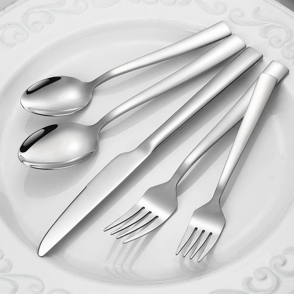 20 pcs silverware set for 4: Stainless steel flatware set include 4 dinner forks, 4 dinner spoons, 4 dinner knives, 4 teaspoons, 4salad/dessert forks, suitable for most families.Provide convenient and enjoyable dining experience. Durable Cutlery Set: Flatware set for 4 is made of high quality stainless steel, rust resistant, shiny mirror polished finish, smooth surface make it extremely easy to care, not easy to bend, safety and healthy for use. Ergonomic Elegant Design:Tableware set not heavy but sturdy enough,modern silverware set features square edge,ergonomically designed provide a comfortable grip for adults and children. High quality kitchen eating utensils would make you better enjoy your food. Modern Shining Design: 20 piece silverware set is great mirror polished make silverware set always keep shinning, Its stylish and elegant appearance almost all styles of tableware and kitchens. And completely dishwasher safe saves you trouble. Perfect for various Occasion: Forks and spoons silverware is suitable for home daily use, travel, restaurant, wedding party, comes gift box package, perfect as a gift for your family and friends on Thanksgiving Day, Halloween, Christmas Day.