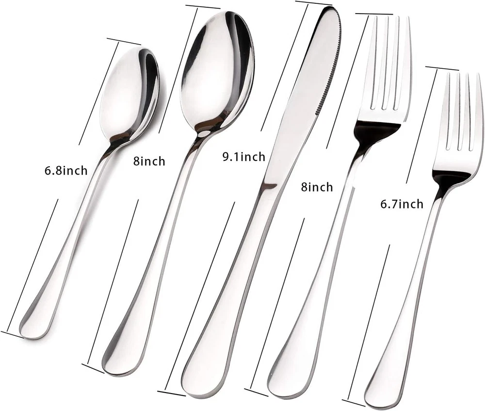 Silverware Set for 8, 40 Piece Heavy Duty Stainless Steel 40 Piece, Silver Product Details Brand: Stilloye Number of Pieces: 40 Material: Stainless Steel Color: Silver Product Care Instructions: Dishwasher Safe Recommended Uses For Product: HOME Special Feature: Dishwasher Safe, Rust Resistant Finish Type: Polished Included Components: silver silverware Style: Modern Item Weight: 4.85 Pounds Is Stain Resistant: Yes Is Dishwasher Safe: Yes Manufacturer: Acnusik Product Dimensions: 9.25 x 3.74 x 2.56 inches Item Weight: 4.85 pounds Item model number: Stainless Steel Flatware Set for 8 SET OF 40 PIECE: 40pcs stainless steel silverware sets includes 8 of each: Dinner Knives , Dinner Forks , Salad Forks, Dinner Spoons, and Teaspoons, well packing in a gift cardborad box. PREMIUM MATERIAL: Silverware set 40 piece solid made of high quality premium stainless steel, Rust resistance and nickel free, Healthy for daily use, Easy clean and dishwasher safe. Solid construction ensures everyday usage and durability, No worry about bending. DISHWASHER SAFE: This spoons and forks set stainless steel (forks spoons and knives set stainless steel, tableware set) is healthy for everyday use, dishwasher safe is really convenient for customers. Even after numerous uses and washings, this contemporary silverware set will not lose its mirror-like polish. ERGONOMIC DESIGN: Elegant flatware set delivers the ultimate dining experience as everyday spoons silverware comfortably in your hand and weighs only as much as utensils set stainless needs to. Contemporary design with square edge ends, Simple and classic flatware blends with many dinnerware, Elevate dining experience with decent eating utensils sets. VERSATILE: Sturdy Silverware Set for 8 is perfect for home, restaurant, hotel, Suitable for wedding, travelling, camping, party, catering, Also as a decent gift for family and friends.