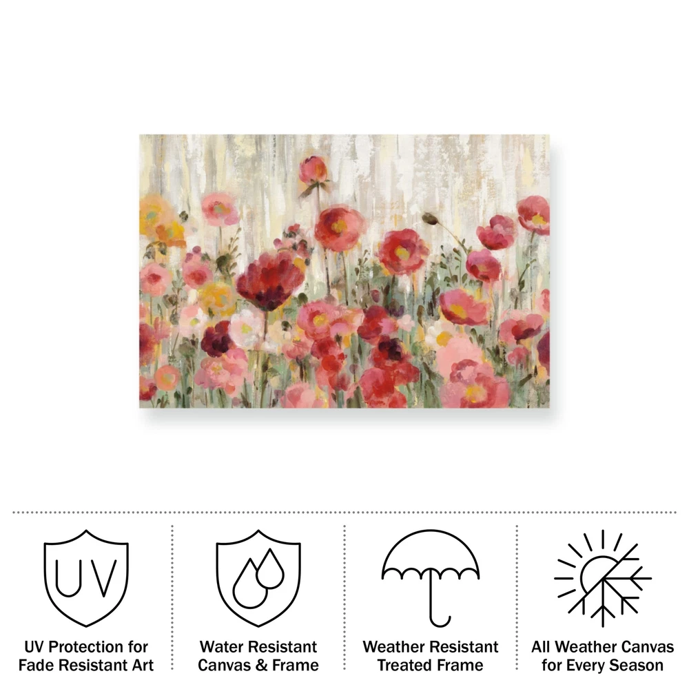 Artist: Silvia Vassileva Subject: Floral Style: Traditional This ready to hang, gallery-wrapped art piece features red flowers on a distressed background. Prominent Colors: White, Pink, Tan, Red, Yellow Silvia Vassileva pursued her love of art at the Academy of Fine Art in Bulgaria, where she earned both her bachelors and masters degrees. She spent six years painting and exhibiting her work in Japan before moving to the U.S. Silvia describes her style as very free and bold. She makes her paintings come alive by using contrast and unusual color palettes. Silvias home studio, which she designed herself, is bright, contemporary and minimalist. The Outdoor Canvas Art by is a great way to add a pop of color to your poolside, balcony, backyard, garden, or porch. This all-weather outdoor décor is printed with UV inks to prevent fading for years to come. These colorful outdoor pictures for the patio have been digitally reproduced, printed on all-weather artist canvas, stretched, and gallery wrapped on all-season stretcher bars for a clean finish. OUTDOOR WALL DECOR - This outdoor wall art is made of all-weather canvas and treated natural wood that can be placed outdoors with direct exposure to the elements without fear of fading. WATER RESISTANT CANVAS - Specifically designed to be placed out in the elements, our weather resistant canvas will provide long-lasting use in any outdoor location. DIGITALLY REPRODUCED - The sharp, colorful photographs on the outdoor art have been digitally reproduced with vibrant colors, printed on artist canvas, and stretched on all-season stretcher bars. GALLERY WRAPPED - This canvas outdoor wall art is gallery wrapped, meaning the print is wrapped tightly around the frame and secured at the back for a clean finish and an art-gallery-style look. PRODUCT DETAILS - Materials: All-Weather Canvas and Weather Treated Natural Wood. Mounted Hanger Included. Whether it's a contemporary, rustic, modern, or traditional style decor, offers a variety of high-quality, carefully built wall art that will surely complement any style. We provide an abundance of art themes that range from fascinating abstracts to breathtaking landscapes. With an assortment of sizes and styles such as Framed, Matted Framed, Panel, Aluminum, Wood Canvas or other mediums, our art will certainly bring excitement to any area of your home. From the bedroom, to the living room, or even the office, makes professionally handcrafted, ready to hang wall decor that will be admired for years to come! IMPORTANT: Avoid buying counterfeit products and transacting with unauthorized sellers. Look for our logo on the packaging for every of our products. is committed to providing the consumer with the absolute best price and value on our entire line of products, which we ensure by applying a rigorous Quality Control process. is a registered trademark protected by U.S. Trademark law and will be vigorously defended. Artist :Silvia Vassileva Subject:Floral Style:Traditional Description:red flowers on a distressed background. Made in the USA