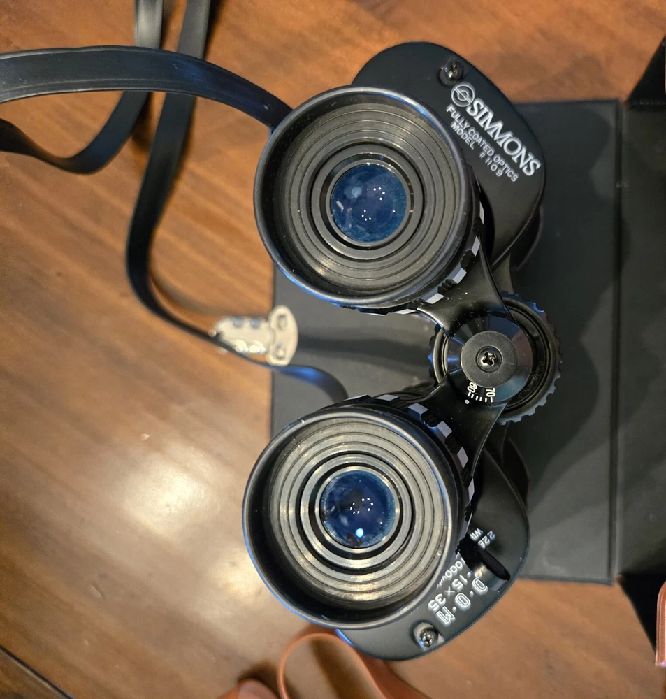 Simmons Binoculars Model #1109 are versatile binoculars with a maximum magnification of 15x and a 35mm objective lens diameter. They feature fully coated lenses, a wide-field lens, and a zoom lens for detailed viewing. The binoculars come equipped with lens covers for protection and are ideal for general-purpose use. Includes storage/carrying case with strap
