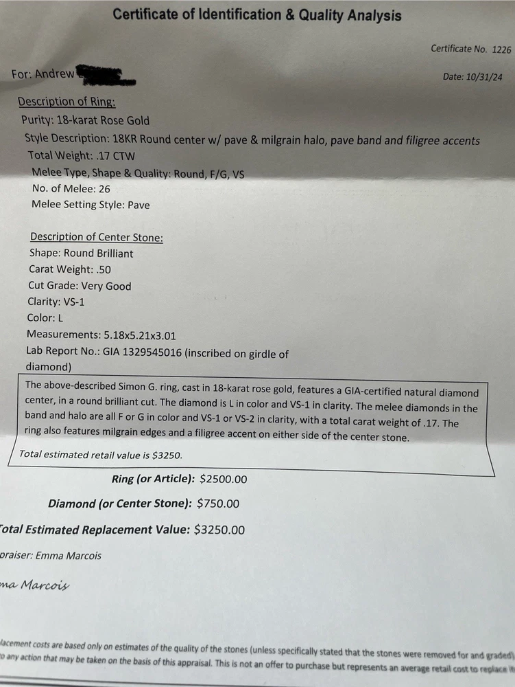 Never Been Worn! It is an 18 Karat Rose Gold Ring consisting of a Center Round Cut Diamond that weighs .5 carats in a 4 prong setting. The diamond is graded by the Gemological Institute of America, report number G-1329545016, and measures 5.18x5.21x3.01 millimeters. The Color Grade is L and Clarity Grade is VS1. The mounting is designed by Simon G. Jewelry and consists of brilliant round cut diamonds with an estimated combined total weight of .17 carats I have all paperwork for this ring.