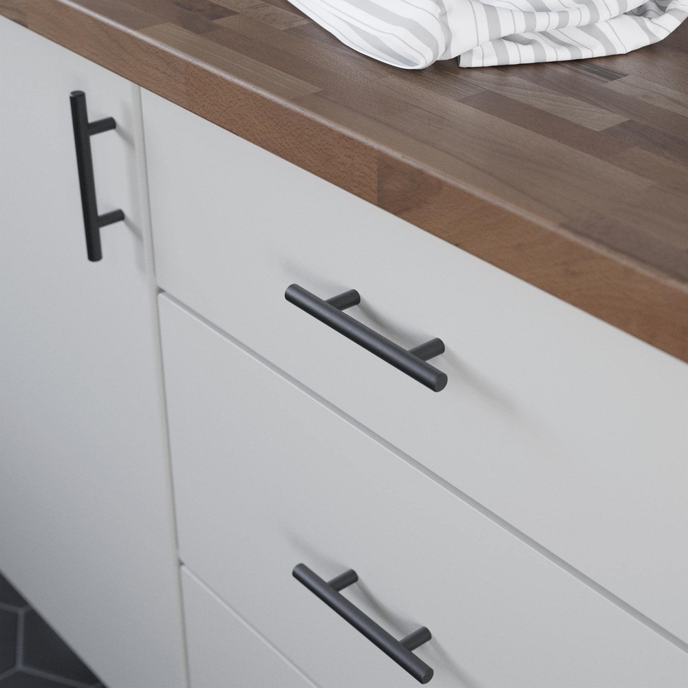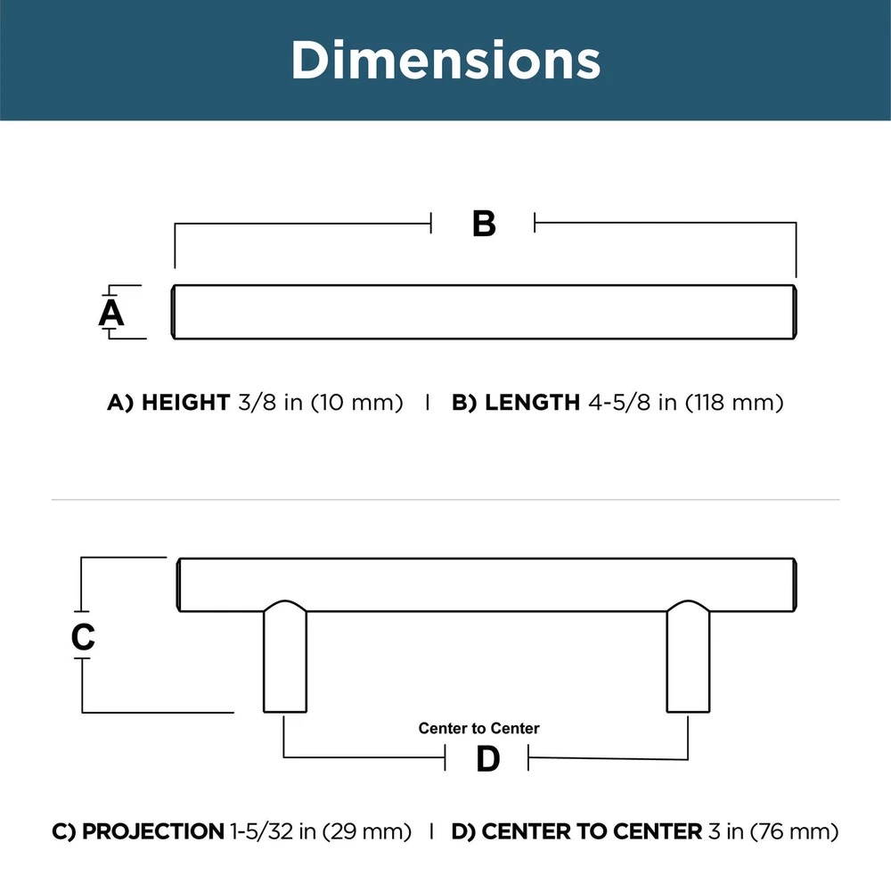 The Simple Bar cabinet pull collection makes it easy to give an updated look to your kitchen, bathroom, office, or furniture. The Modern cabinet handle design makes it the perfect addition to your cabinets, desk, and even dresser drawers. Available in multiple finishes and pack sizes to fit any home decor project and cabinet hardware style. STYLE: Easily update your kitchen and bathroom cabinets or furniture with our modern cabinet hardware collection. MATERIAL: Our black finish provides a complimentary tone to the metal handles. SIZING: The collection of drawer pulls measures 3 (76mm) center-to-center and comes in a pack of 10, so you can make your cabinet upgrades in bulk. DURABLE: We work with highly durable materials to ensure your cabinets and drawers are equipped with top quality hardware that will last for years. EASE OF USE: Our simple bar pulls are specially designed for easy installation and use.