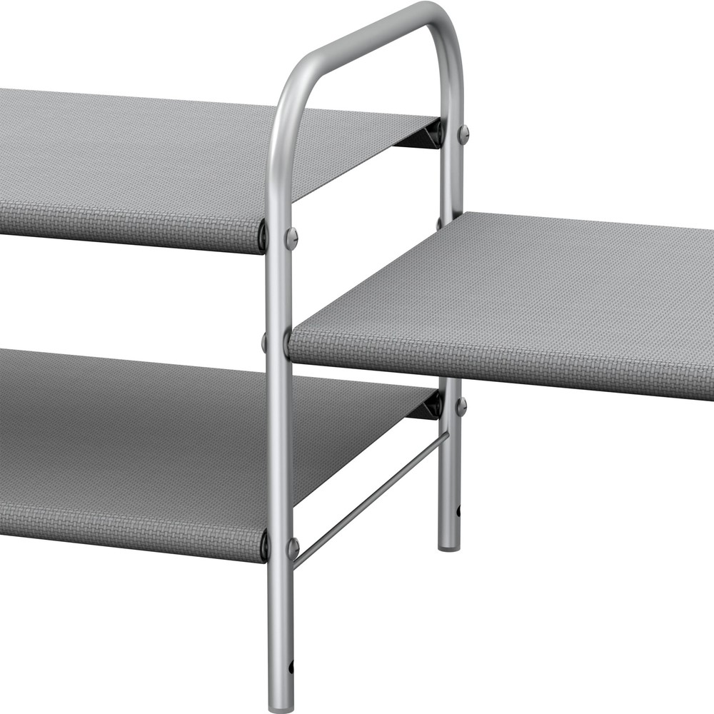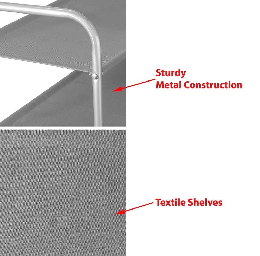 SimpleHouseware 2-Tier Shoe Rack Storage Organizer, Grey Stores up to 12-15 pairs of shoes, Additional bottom storage for slippers. Sturdy metal construction with washable 600 D polyester fabric, each shelf holding up to 30 lbs. Easy Assembly Personalized Storage: You can remove the panel to build into a 2-tier or 3-tier shoe rack to fit different kind of shoes. Great solution to keep your entryway, closet, dormitory, patio, mudroom and garage away from mess. Product Dimension: 11.2''D x 26.8''W x 15.1''H