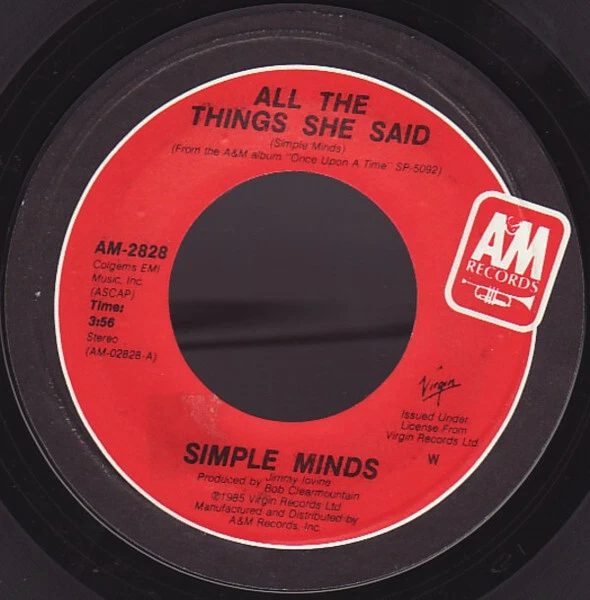 Simple Minds, All The Things She Said, 7", Styrene, W Catalog Number: AM 2828 Comment(s) and Condition Grade specific to this listing: ***Picture Sleeve Not Included. Beautiful vinyl, bright clean label. Packed carefully, shipped quickly.. Packed carefully and shipped quickly.*** Media Condition: Near Mint (NM or M-) - Based on visual inspection. Sleeve Condition (GENERIC = no picture sleeve): Generic STOCK PHOTOS HAVE BEEN USED WITH LISTING: Photos shown have been pulled from an online databas. A picture / company sleeve / CD insert in the photo does not guarantee it is included. If a picture sleeve / insert is included, its Condition will be filled in above this line. SOME SPECIFICATIONS ARE AUTO-FILLED: If there is something specific you require, please ask us to confirm. DOO WOP RECORDS: Unless specifically stated otherwise, you can assume the record is a reissue. Feel free to inquire about matrix / runout number. Thank you for having a look at our record collection! Be sure to follow us so you're notified when we post new items. IMPORTANT NOTE: A picture sleeve in the stock photo of a vinyl record does not guarantee a picture sleeve is included with this item. If the vinyl record sleeve condition specifies "Generic" THERE IS NO PICTURE SLEEVE (item will come in a company sleeve or plain sleeve.) Track List : A. All The Things She Said 3:56 B. Don't You (Forget About Me) (Live) 9:05 Credits: Notes on shipping: All records are packed carefully and shipped quickly. Domestic postage is included with the price. International customers buying multiple items: Please group items into a single order and hold payment until package weight/dimensions can be adjusted. Notes on Media and Sleeve Grading (visual inspection only): Sealed: The vinyl is graded as "Mint." It is unopened/unplayed/intact. Near Mint: The record has no obvious signs of wear. Part of an exceptional collection, curated with care, carefully handled, and properly stored. Very Good Plus: A minimal amount of storage or play wear, if present, will be superficial, difficult to see, and will not detract from sound quality. Very Good: Pronounced storage wear and, maybe, a few superficial scratches are present. There may be some noise during playback but no skips. Good Plus or Good: Significant noise can be expected on playback due to visible scratches and/or groove wear. Sleeve Grading: Near Mint: Sharp spine with crisp edges. May have age-related (but minor) wear & tear. A very nice sleeve suitable for most collectors. Very Good Plus: Sleeve may have a small sticker or bit of writing but looks great. Minimal ring wear. Very Good: Acceptable cover but may have drill hole or cut corner. May have split sides, large sticker, or prominent ring wear. Good Plus: Obvious wear and tear. Minor to major flaws.