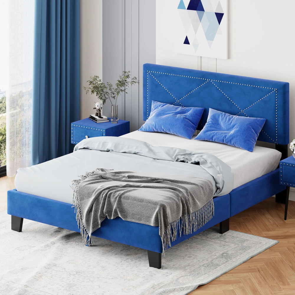 Simple Queen Size Upholstered Bed Frame with Rivet Design, Modern Velvet Platfor