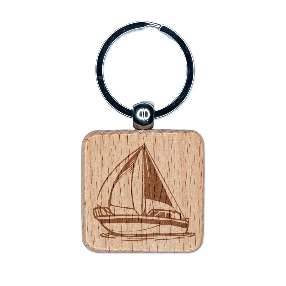 Simple Sailboat on Ocean Water Engraved Wood Square Keychain Tag Charm