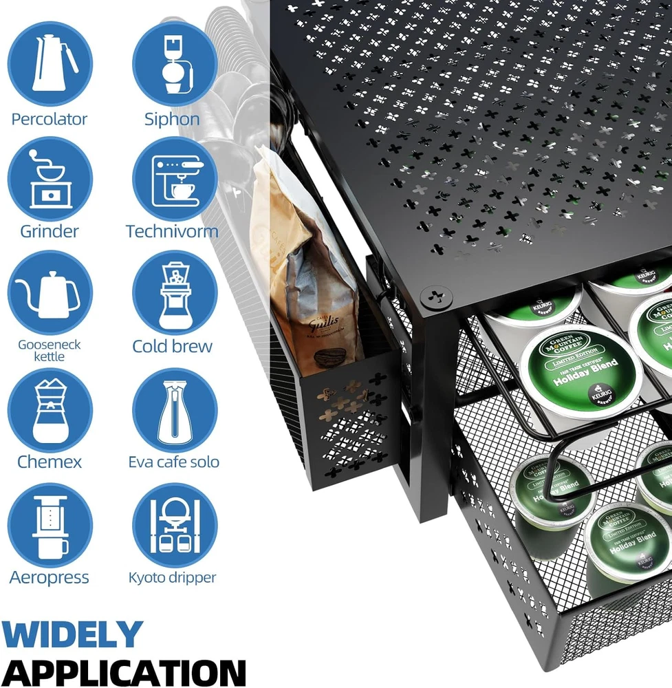 Simple Trending Coffee Pod Holder for K Cups, with 20"D x 10"W x 5.8"H, Black Product Details Material: Metal Color: Black Product Dimensions: 20"D x 10"W x 5.8"H Shelf Type: Pull-Out Shelf Number of Shelves: 2 Finish Type: Black Assembly Required: Yes Recommended Uses For Product: Coffee Included Components: Two pull-out drawers and two side frames Item Weight: 2.2 Pounds Brand: Simple Trending Style: 5.8" Tall Manufacturer: Simple Trending Part Number: 1 Item Weight: 2.21 pounds Item model number: 1 Size: 20"D x 10"W x 5.8"H Finish: Black Number Of Pieces: 1 Batteries Included?: No Batteries Required?: No Material: Metal Color: Black Product Dimensions: 20"D x 10"W x 5.8"H Shelf Type: Pull-Out Shelf Number of Shelves: 2 LARGE CAPACITY: Holds 63 K cup or 83 Capsule Measuring Cups for a wide range of brands of coffee pod capsules for easy storage of your coffee capsules,The hanging baskets on both sides can be used to store spoons, coffee sticks, straws and more TWO SLIDING DRAWERS DESIGN: The hanging drawer can hold 35 k cup or 35 coffee capsules, the dividing drawer can hold 28 k cup or 49 coffee capsules,the drawer can be removed and there is a layer of space for storage DURABLE: Sturdy metal frame makes it more stable and can support heavy coffee maker, providing strong support for the coffee maker, The baking paint process makes the product more resistant to corrosion EASY INSTALLATION: The K cup holder has 4 non-slip pads to ensure its firmness and avoid scratching the furniture surface, Simply follow the instructions and it can be installed in minutes SIZE: 20 "W x 10 "D x 5.8 "H, top 16 "W x 10 "D, hanging drawer size 14.5 "W x 9.8 "D x 2.8", divider drawer 14.4 "W x 8.8 "D x 2.2 ", If you have any questions, please feel free to contact us, we will reply within 24 hours