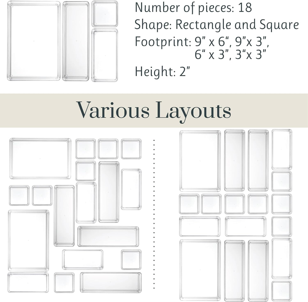 Store New Arrivals Add to Favorite View Feedback Contact Simplesort 18-Piece Stackable Clear Drawer Organizer Set | Multi-Size Trays | Makeup Vanity Storage Bins and Office Desk Drawer Dividers | Made in USA Description Item model number 6088 Style 18-Piece Set Number of Items 18 Batteries Included? No Number of Compartments 18 Unit Count 18.0 Count Batteries Required? No Finish Polished Product Dimensions 9"D x 6"W x 2"H Material Plastic Mounting Type Tabletop Mount, Insert Mount, Free Standing Item Weight 4.2 Pounds Finish Type Polished Specific Uses For Product Cosmetics Item Package Quantity 1 Item Weight 4.2 pounds Special Features Durable, Stackable Special Feature Durable, Stackable Part Number 6088 Color Clear Shape Rectangular Number Of Pieces 18 Size 18-piece set American made with high-quality, durable BPA-free clear plastic. Domestic production of these organizers provides you with the peace of mind that you're buying a product that contributed less carbon emissions to the atmosphere from creation to delivery than those produced overseas. Multipurpose trays will help maximize space around the home, allowing you to keep every room tidy. Organization and storage with these clear acrylic bins allows you to find what is in each quickly, making organizing fast and easy. The stackable design makes these organizers compatible with both shallow and deep drawers that are found in bathrooms, kitchens, cabinets, closets, and offices. They make a great space saving option for , makeup, jewelry, kitchens utensils, cleaning tools, and office supplies. Customize your layout of these containers to fit any bathroom, dresser, vanity, or desk drawer space. Multiple layout combinations can be created using the same set of dividers. Purchase additional sets as your organizing needs for everyday items such as make up and other household supplies expand. Set of eighteen includes four different sizes (8) 3-inch by 3-inch, (4) 6-inch by 3-inch, (4) 9-inch by 3-inch, and (2) 9-inch by 6-inch shallow drawer organizers Product Description Time to get your drawers organized! With many applications and configurations, these individual organizers can fit side by side to sort daily essentials in your drawers! Each container easily stacks for multiple layers of storage. Great for deep drawers! Purchase additional sizes to customize your organizational needs. Create modular sets to organize drawers in your entire house. Clear, break-resistant plastic fits in any décor. No assembly required. Cleans easily with mild soap and warm water. Made in USA. About STORi STORi, a brand that creates beautifully imaginative ways to store, stack and sort everything in your home. Our products are made primarily in the USA to exacting standards and we continuously freshen our product lines to ensure that you can keep everything in its place! Imagine your life organized. This stackable drawer organizer collection keeps office, vanity, and junk drawers organized. The clear design compliments any style. Keep makeup sorted in vanities. Also use in craft room drawers for pens, markers, and brushes. These drawer bins can be used side-by-side or stacked to save space. Recessed bottoms for sturdy stacking Easily slide small organizers across larger Proudly made in USA STORi Stackable Drawer Organizers | Clear Organize your workspace Sort desk essentials easily! Pencils, pens, and paperclips fit perfectly in small organizers. Keep paper, calculators, and scissors in wider compartments. Customize your drawer with multiple sets and sizes. Keep tidy Simplify your morning routine! Vanity drawers stay tidy with organizers for makeup brushes, palettes, and lipstick tubes. Use modular organizers for skincare products: remover wipes, serum bottles, and lotion pods. Simple kitchen drawer storage Straighten up your utensil drawer! Large compartment organizers are the perfect size for spatulas, mixing spoons, and whisks. Keep your coffee supplies at your fingertips, long organizers are perfect for k-cups and teabags. ABOUT US We offer the best prices around on high quality products. Our E-store includes media such as books, movies, music and games while offering electronics, toys, sporting apparel, clothing, tools, general home, garden items and more. SHIPPING We are always working hard to ensure your package arrives as soon as possible. Please understand that some factors like weather, high postal traffic, and the performance of shipping companies are outside of our control. We offer free shipping to the lower 48 states and ship within 2 business days of payment, usually sooner. We do not accept P.O. Boxes. Please provide a physical address. RETURNS No returns are available on items shipped outside of the USA. PAYMENT We accept PayPal. CONTACT US This page content is yet to come Please ad us to your favorite seller and visit again later Thank You CUSTOMER SATISFACTION We try our very best to make sure every customer is completely satisfied. If there's a problem, message us! We're happy to help.