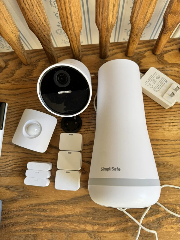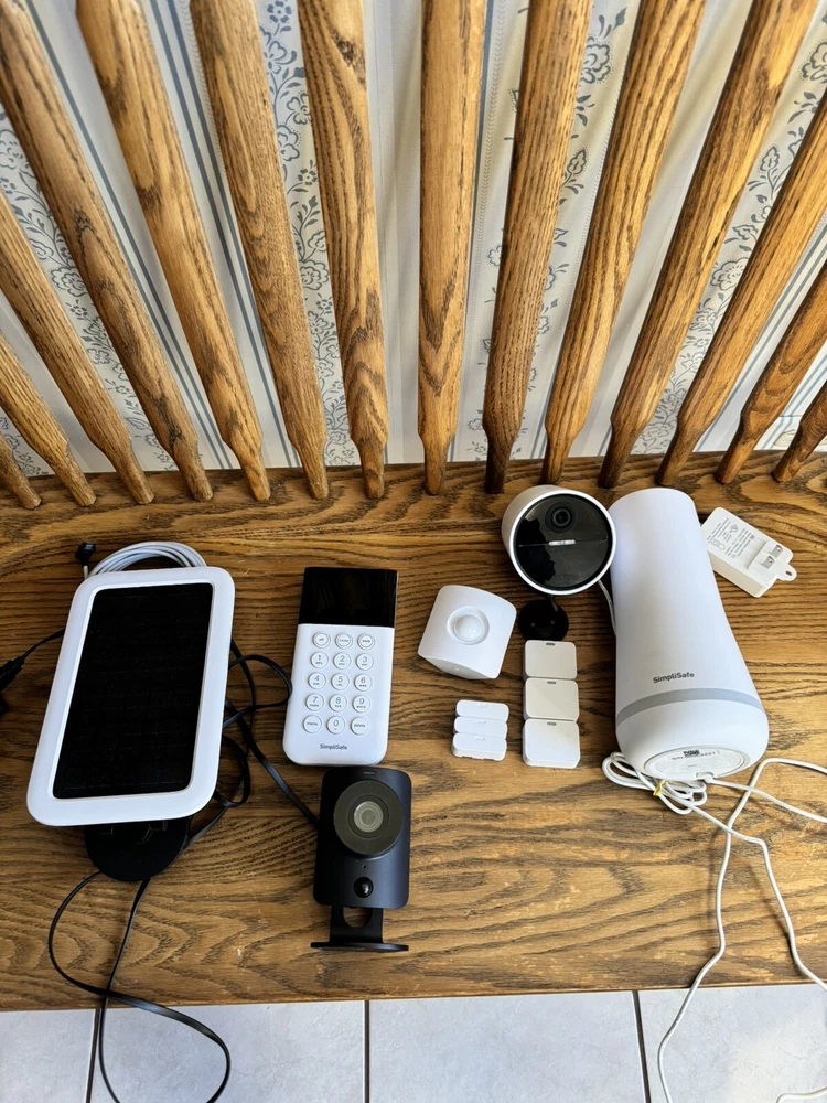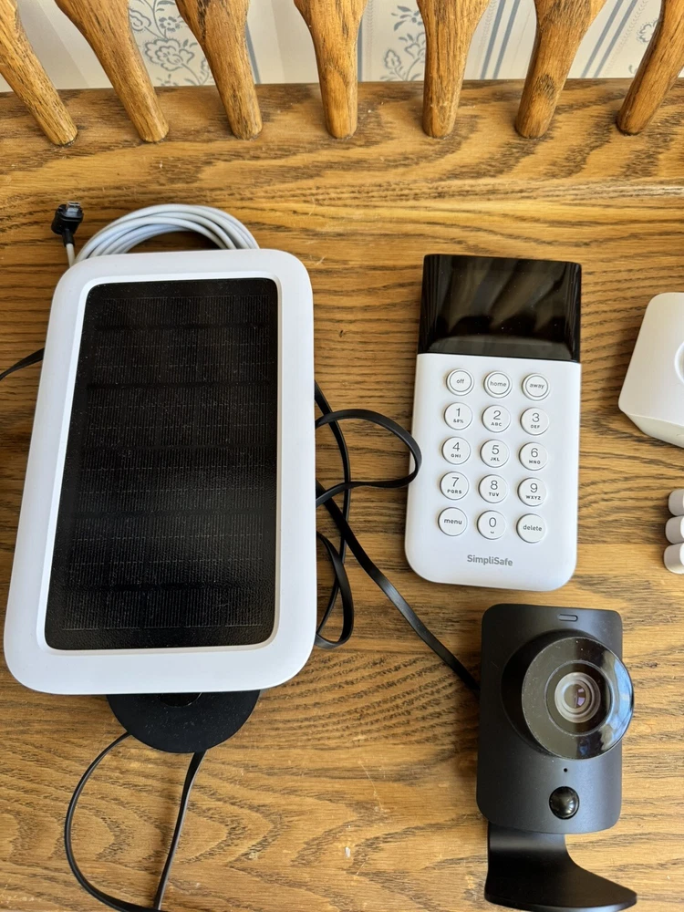 1 base station 1 motion sensor 3 entry sensors 1 keypad 1 outdoor camera with extra battery 1 solar panel for outdoor camera 1 indoor camera