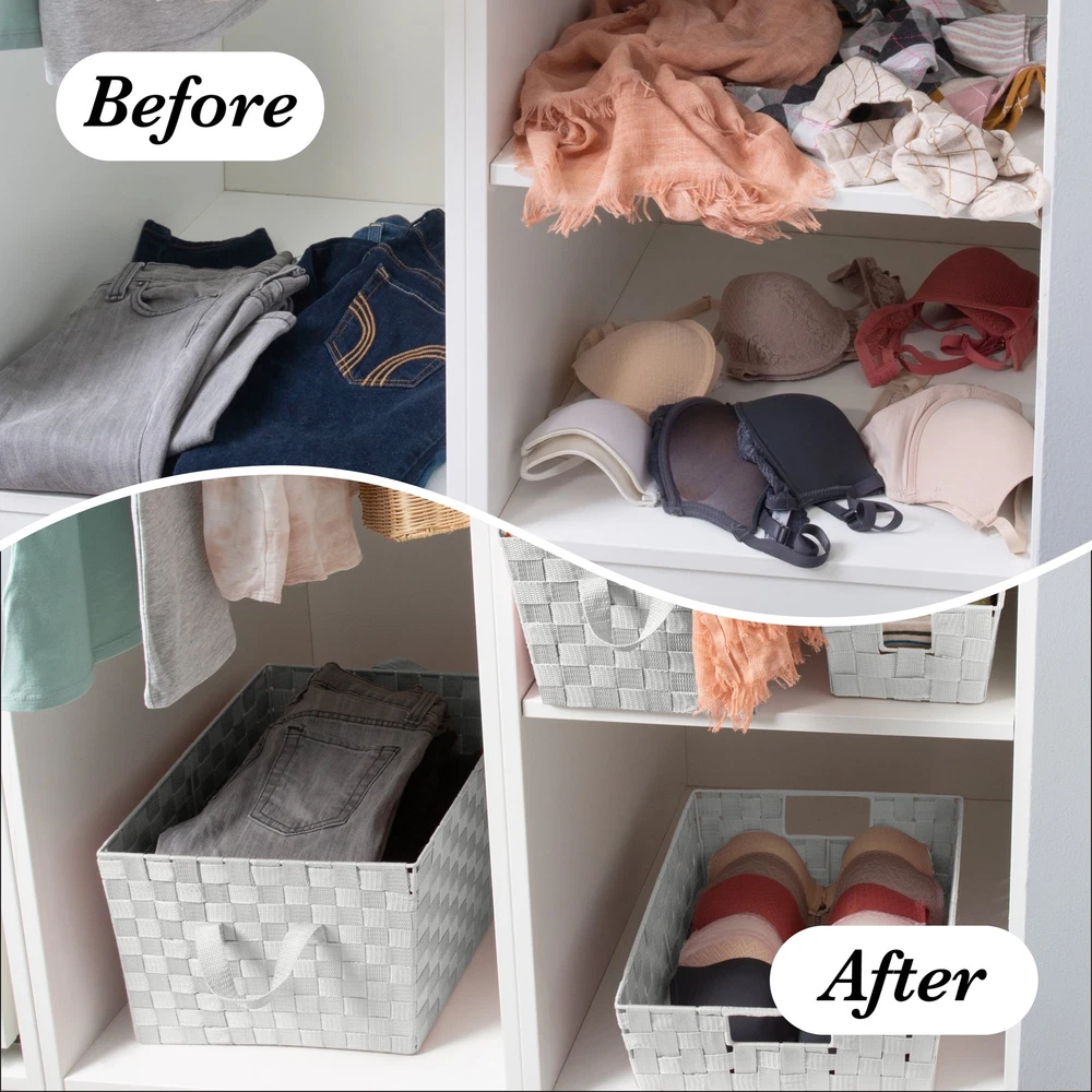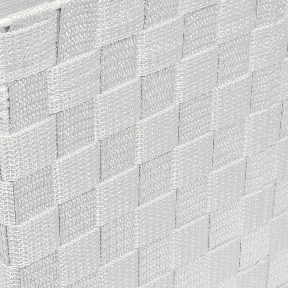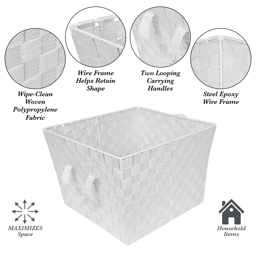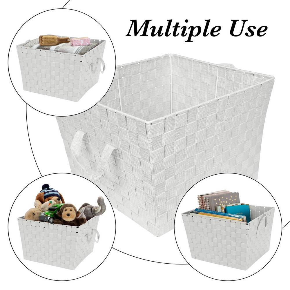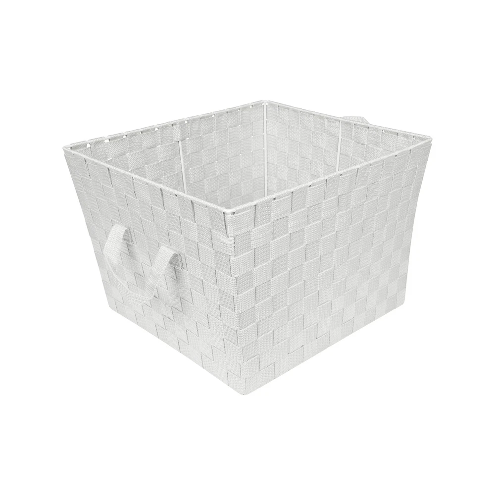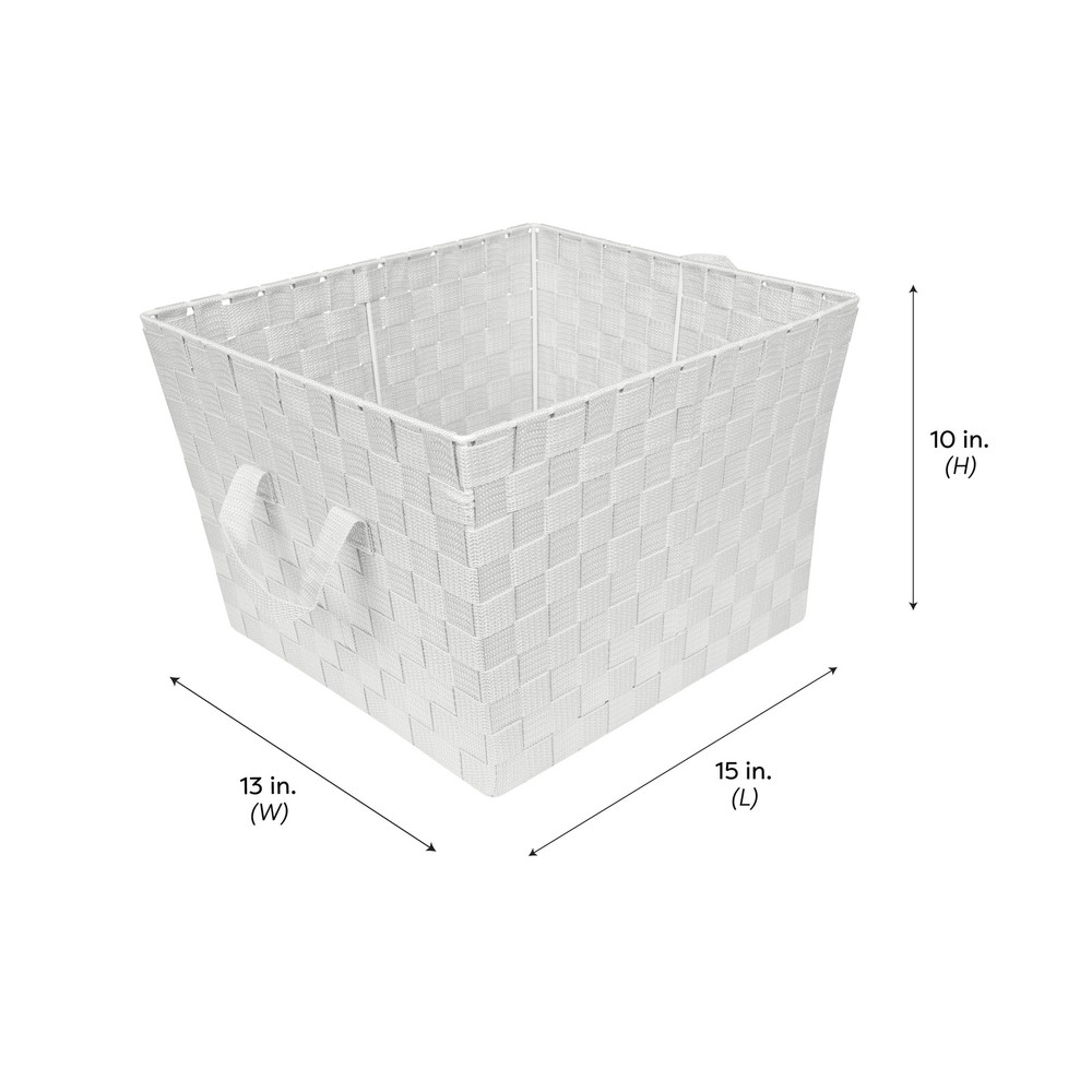 This Simplify Woven Storage Bin is perfect for storage for any room in your home. It is made of sturdy polypropylene with an epoxy wire frame. It has dual handles for easy carrying. It acts as a great storage accessory for all your home needs. Keep in your bedroom or closet to store clothes or blankets. Or keep it in the kids room to help organize toys and games. There are so many uses for this basket. Durable wipe-clean woven polypropylene fabric strapping 2 looping carrying handles Steel epoxy coated frame Storage organizer A multitude of styles/colors to fit any home Wireframe helps retain shape Lightweight design 730g/100m pp woven strap 3.8mm wireframe with powder coating Dimensions: 13"L x 15"W x 10"D
