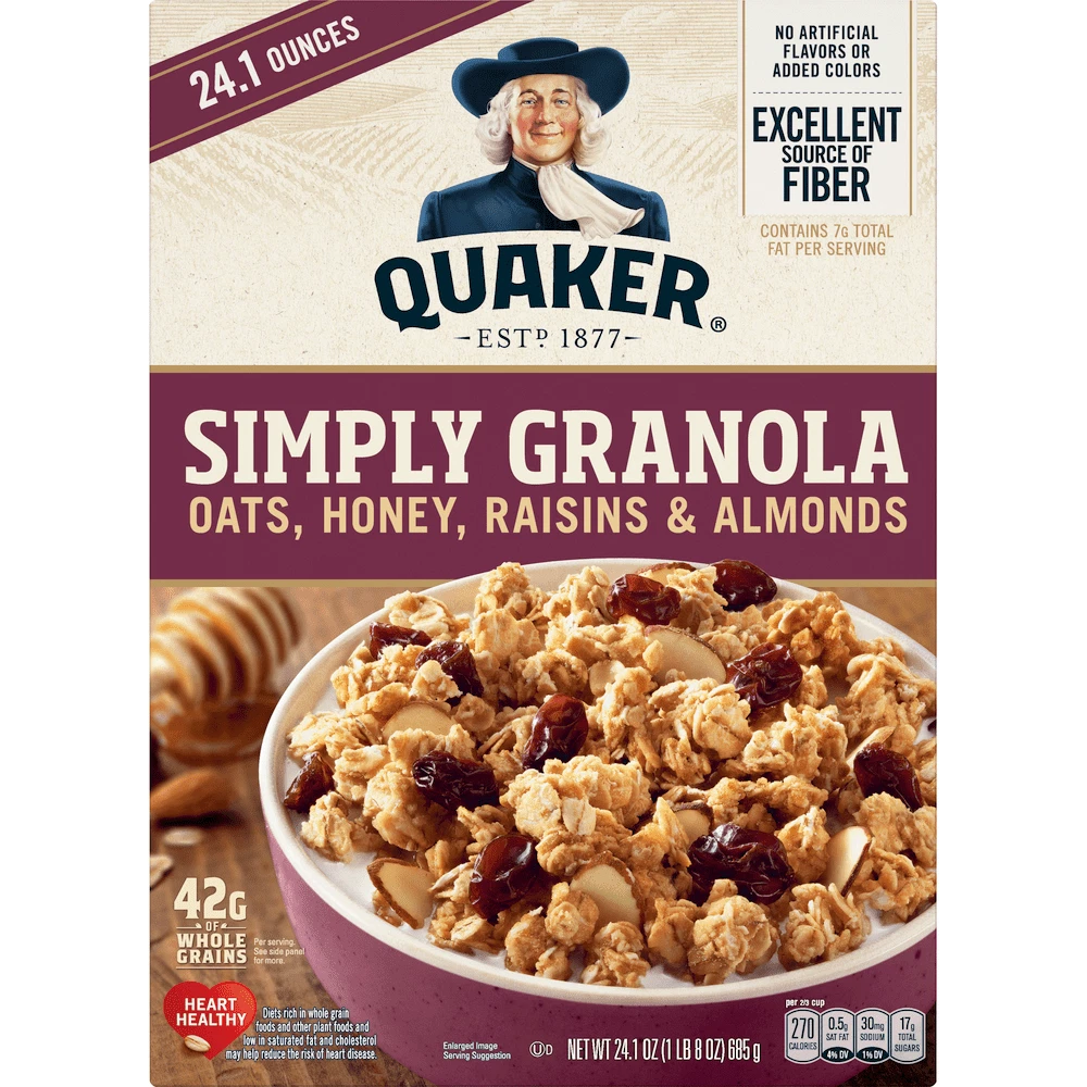 A great morning inspires a great day filled with new possibilities, unknown adventures, and amazing friends. Fill your bowl, tummy, and heart with a nutritious breakfast from Quaker Oats and be ready for whatever's to come. Quaker Oats, Honey, Raisins & Almonds, 24.1 oz, offers a healthy and delicious crunchy oatmeal blend. Made with hearty oats, sweet honey, juicy raisins, and crunchy almonds, this oatmeal provides a satisfying and nutritious breakfast or snack. Enjoy it with milk, yogurt, or on its own, you'll experience the perfect balance of flavors and textures in every bite. Excellent Source of Fiber 42 g Whole Grains Enjoy with milk, yogurt, or as an on-the-go snack No artificial flavors, no added colors. Heart Healthy - A diet rich in whole grains and other plan foods. Low in saturated fat and cholesterol, may help reduce the risk of heart disease.