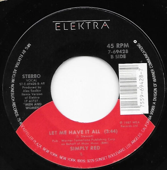 Simply Red, Suffer, 7", Single, AR Catalog Number: 7-69428 Comment(s) and Condition Grade specific to this listing: ***Picture Sleeve Not Included. Beautiful vinyl, bright clean label. Packed carefully, shipped quickly.. Packed carefully and shipped quickly.*** Media Condition: Near Mint (NM or M-) - Based on visual inspection. Sleeve Condition (GENERIC = no picture sleeve): Generic STOCK PHOTOS HAVE BEEN USED WITH LISTING: Photos shown have been pulled from an online databas. A picture / company sleeve / CD insert in the photo does not guarantee it is included. If a picture sleeve / insert is included, its Condition will be filled in above this line. SOME SPECIFICATIONS ARE AUTO-FILLED: If there is something specific you require, please ask us to confirm. DOO WOP RECORDS: Unless specifically stated otherwise, you can assume the record is a reissue. Feel free to inquire about matrix / runout number. Thank you for having a look at our record collection! Be sure to follow us so you're notified when we post new items. IMPORTANT NOTE: A picture sleeve in the stock photo of a vinyl record does not guarantee a picture sleeve is included with this item. If the vinyl record sleeve condition specifies "Generic" THERE IS NO PICTURE SLEEVE (item will come in a company sleeve or plain sleeve.) Track List : A. Suffer 4:30 B. Let Me Have It All 3:44 Credits: Producer - Alex Sadkin Notes on shipping: All records are packed carefully and shipped quickly. Domestic postage is included with the price. International customers buying multiple items: Please group items into a single order and hold payment until package weight/dimensions can be adjusted. Notes on Media and Sleeve Grading (visual inspection only): Sealed: The vinyl is graded as "Mint." It is unopened/unplayed/intact. Near Mint: The record has no obvious signs of wear. Part of an exceptional collection, curated with care, carefully handled, and properly stored. Very Good Plus: A minimal amount of storage or play wear, if present, will be superficial, difficult to see, and will not detract from sound quality. Very Good: Pronounced storage wear and, maybe, a few superficial scratches are present. There may be some noise during playback but no skips. Good Plus or Good: Significant noise can be expected on playback due to visible scratches and/or groove wear. Sleeve Grading: Near Mint: Sharp spine with crisp edges. May have age-related (but minor) wear & tear. A very nice sleeve suitable for most collectors. Very Good Plus: Sleeve may have a small sticker or bit of writing but looks great. Minimal ring wear. Very Good: Acceptable cover but may have drill hole or cut corner. May have split sides, large sticker, or prominent ring wear. Good Plus: Obvious wear and tear. Minor to major flaws.