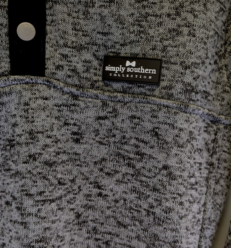 Has been gently loved and still has more to give.This Simply Southern fleece pullover is the perfect addition to your wardrobe. With a mock neck and quarter-snap closure, this hoodie is both stylish and practical. The oversized fit and soft fleece lining make it the ideal choice for any occasion, whether you're traveling, working out, or just running errands. Available in size M and machine washable for easy care, this gray pullover is part of the Simply Southern product line. It's made from high-quality fleece fabric and features a hood for added warmth. Get ready for fall, winter, and spring with this versatile and comfortable hoodie.