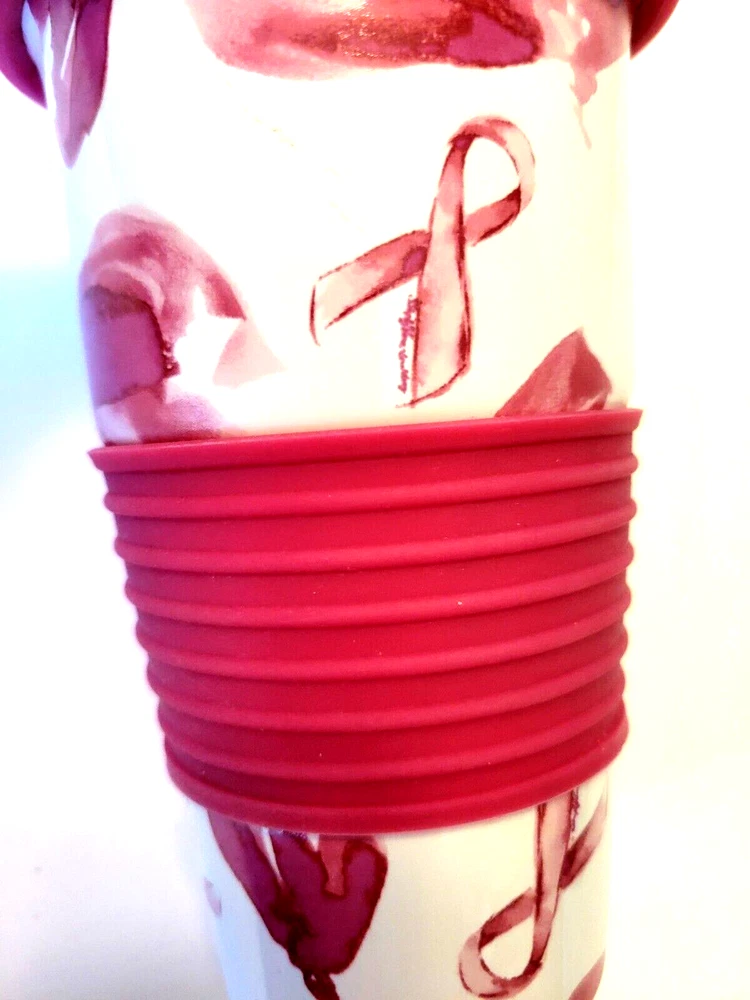 Simply Vera Wang Breast Cancer Awareness Pink Ribbon Ceramic Coffee Mug Tumbler. From Kohls Cares. Hot pink rubber lid and gripper on outside. Nice condition. 6 1/2" high.