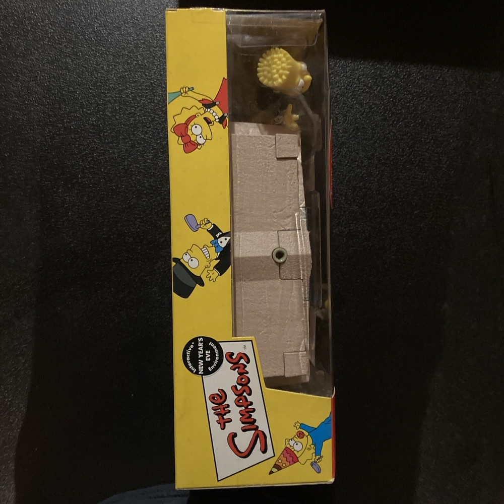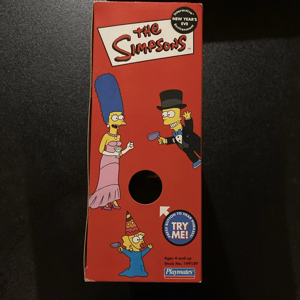 Celebrate the new year with The Simpsons Family WOS New Years Eve Interactive Environment Playmates 2003! This action figure set features the beloved characters Lisa Simpson, Homer Simpson, Bart Simpson, Maggie Simpson, and Marge Simpson in their festive attire. The 5in. plastic figures are unopened and in their original packaging, making them a great addition to any collector's display. The set also includes an interactive environment that allows fans of The Simpsons to recreate their favorite scenes from the TV show. With Playmates Toys as the brand behind this original licensed reproduction, this action figure set is a must-have for any fan of the iconic franchise. Recommended for ages 4+, this set is perfect for collectors and fans alike.