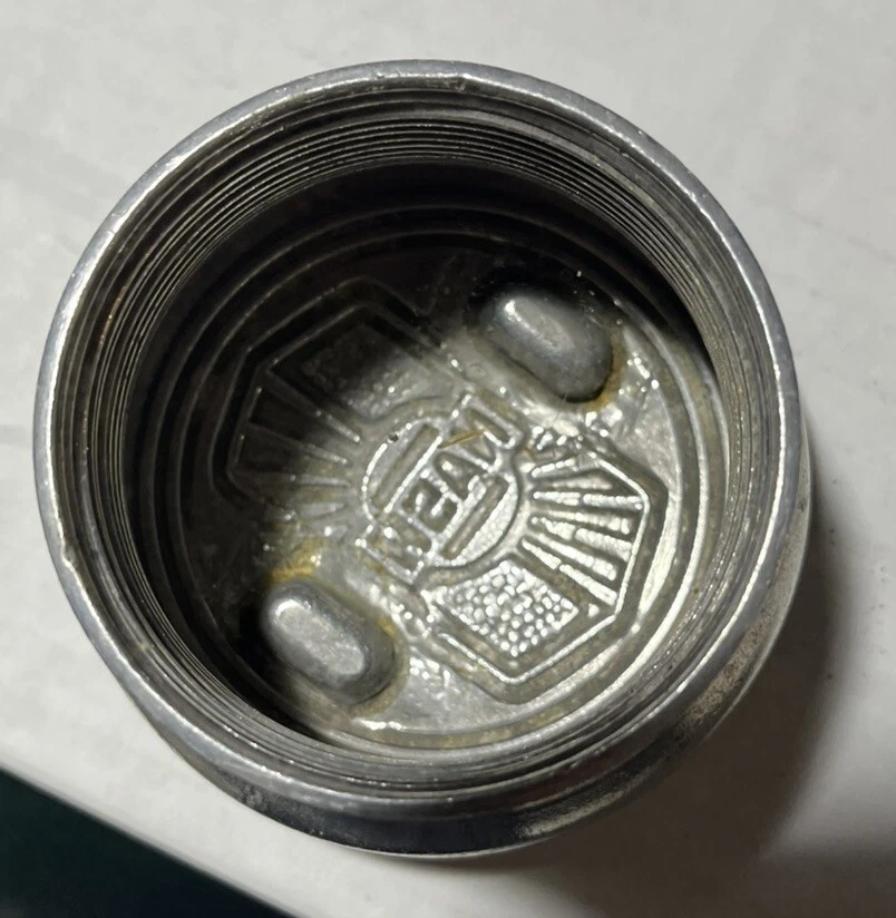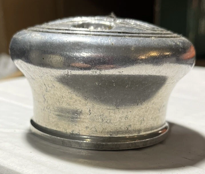 This is a single Nash wheel center cap from the 1920s Brass Era. It is a vintage metal cap with Nash emblem, designed for easy installation on the lower part of the wheel hub. Made in the United States, this silver cap serves as a threaded dust cover and grease cap for a classic Nash vehicle.