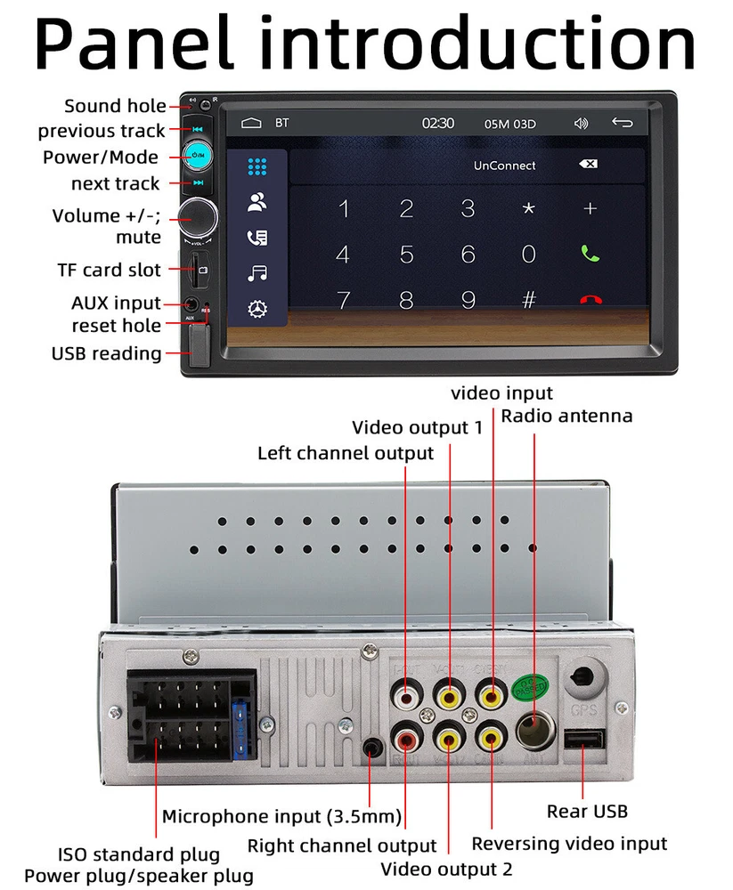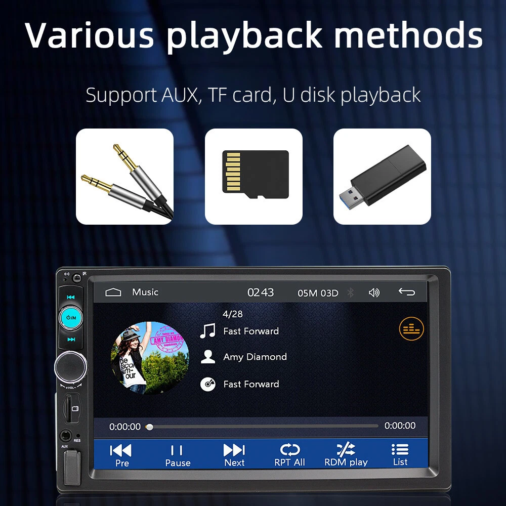 7 inch single 1 Din Car Stereo Radio Mp5 Player Apple CarPlay/Android Auto Features: 1. Mobile phone interconnect Android AUTO / Apple CarPlay 2.Smartphone Mirror Link Android / iOS 3.Radio FM 4. U disk (audio / video / photo) 5. AUX input function 6. Bluetooth function 7. RCA audio output can be connected to the subwoofer 8. Reverse rear view function (Camera included!) 9. Button seven color to choice 10. Video entry 11. Original car steering wheel learning function Product details: Model: F7010c Voltage: DC 12V Type: Car MP5 Player System: Sunplus ecos system Configuration: Full capacitive touch screen Size: Single 1 din Screen size: 7 inches Resolution: 1024x600 Panel size: 178x100mm Lighting panel: 7 Color lights Host depth: 55mm Single weight: 680g CarPlay: Wired connection Android Auto: Wired connection Mirrorlink: Miirorlink (Android / iPhone) Radio: FM1/FM2/FM3 Radio chip: ZT0811 Power: 60W Audio Output: 4x 50W Temperature: -10 ~ 60 ℃ Reverse image: Support Brake reminder: Support Steering Wheel Control: Support Bluetooth: version 5.0 Amplifier chip: CD7388 Radio frequency: FM 87.5 ~ 108MHz Video output: Support Remote control: 21 silicone keys USB interface: Front panel USB 2.0 Reset Button: Have RCA terminal: 2 audio output, 1 reverse input, 1 video input, 2 video output AUX input: Have Audio Format: MP3 / WMA / AAC / APE / OGG / M4A / RA / WAV Video Format: H264 HD (720P 1080I 1080P) AVI / FLV / MKV / RMVB / MPEG / ASF / TS / H264 / QT Picture format: JPEG / PNG / BMP / GIF / TIFF Language: English / Spanish / Portuguese / Simplified Chinese / Chinese / Traditional Chinese / German / French / Turkish / Japanese / Russian / Italian / Polish / Dutch / Danish / Greek / Israelis Package Included: 1 x Car MP5 Player 1 x Power Cable 1 x Remote Control 1 x Steering Wheel control remote 1 x Backup Camera 1 x Microphone 1 x User Manual