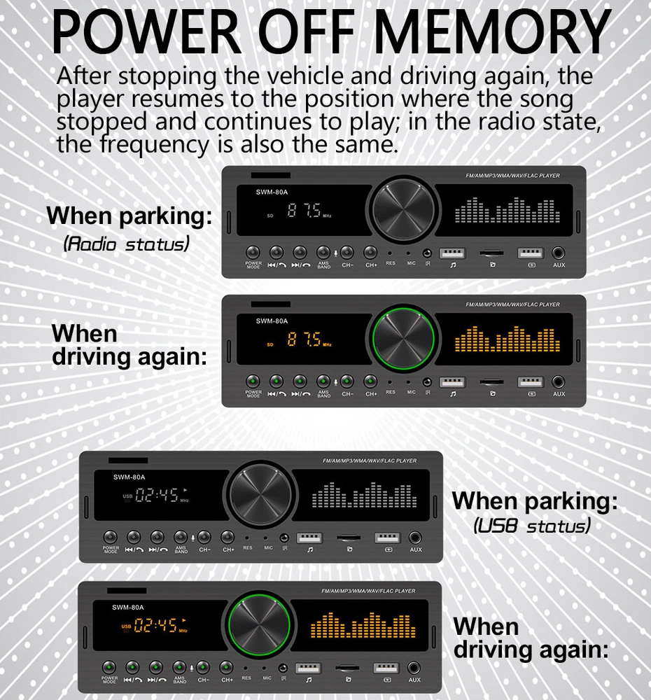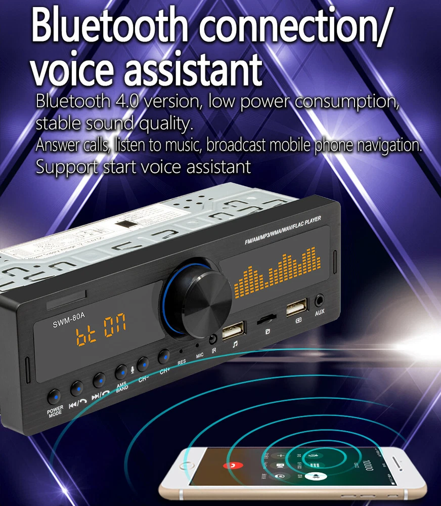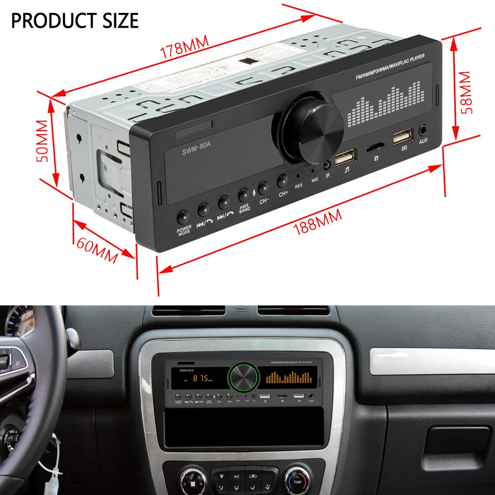 Features: Bluetooth + built-in microphone 2 USB, USB fast charging Support for hands-free calls. Support car locate via smart-phone APP. Support advanced audio transmission mode. Support the clock indicating that the power is off. High-quality digital stereo AM/FM radio Radio frequency:FM(87.5~108MHz)/AM(522~1620KHZ) Support for USB / TF card reader Audio support: MP3 / WMA / WAV formats and so on. Support folder reading function Support for remote control. Electronic rotary volume control MP3 playback supports pause / preview / repeat / random play and 10 up / down selections. Electronic type bass / treble / left and right balance / front and rear balance volume control Front AUX audio input port Rear L / R terminal RCA audio output port. 4-track high-power output (4 high-power speakers) Working voltage: DC12V Radio: Model: SWM-80A Main function: MP3, 2 USB, TF interface, AM, FM, Bluetooth, auxiliary input Audio format: MP3 / WMA / WAV formats and so on. Amplifier output power / channel: 60W x 4 Interface: 2 USB / TF / AUX IN Input voltage: 12V Bluetooth version: V4.0 Dimensions: 183mm (L) x 53mm (H) x 60mm (W) Note: 1. This car multimedia player is compatible with all cars. Please check the size of the product. 2. Installation requires knowledge of electronic products. Please install it with professional help. 3. If you are unsure whether this model is suitable for your car or not, you can send a message to our customer service for assistance. Package Included: 1x car stereo 1x remote control 1x power cable 1x English user manual 1x mounting kit Shipping 1. We ship to Worldwide,e xcluded some far away places. 2. We only ship to confirmed PAYPAL address; your PAYPAL address must match your Shipping address. 3. Any non-received items caused by invalid address registered on PayPal are not in our full refund or replacement policy. Shipping fee has including the local handing and packaging fee. 4. All the items will be shipping within 1-2 working days after receiving the payment, except some holidays. 5. When the shipping method is express delivery, some areas need to pay remote fees to the courier company. Taxes, Customs & Duties 1. Some countries are required to collect customs duties. Please confirm your local customs duties before placing orders. 2. We will not be responsible for any custom delay or tax, because transit time is highly depended and provided by postal Service. Returns 1. If you have not satisfied as you received the item, please return it within 30 days for a replacement or money back. Please contact us before you return it. 2. All returned items must be in the original packaging with all components and accessories included, and you must provide us the return shipping information (The shipment or the tracking number) 3. Return shipping fee is to be paid by the buyers. We will not be responsible for any custom duty or import tax. Warranty 1.One Year Manufacturer's Warranty for defective items (excluding items damaged and/or misused after receipt). 2.Defective items must be reported and returned to us within the warranty period (and in the original packaging, if possible). You must tell us what the defect is and give us your eBay ID. We do not repair or replace items with an expired warranty. Feedback