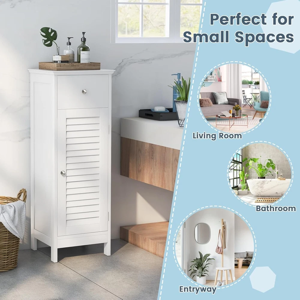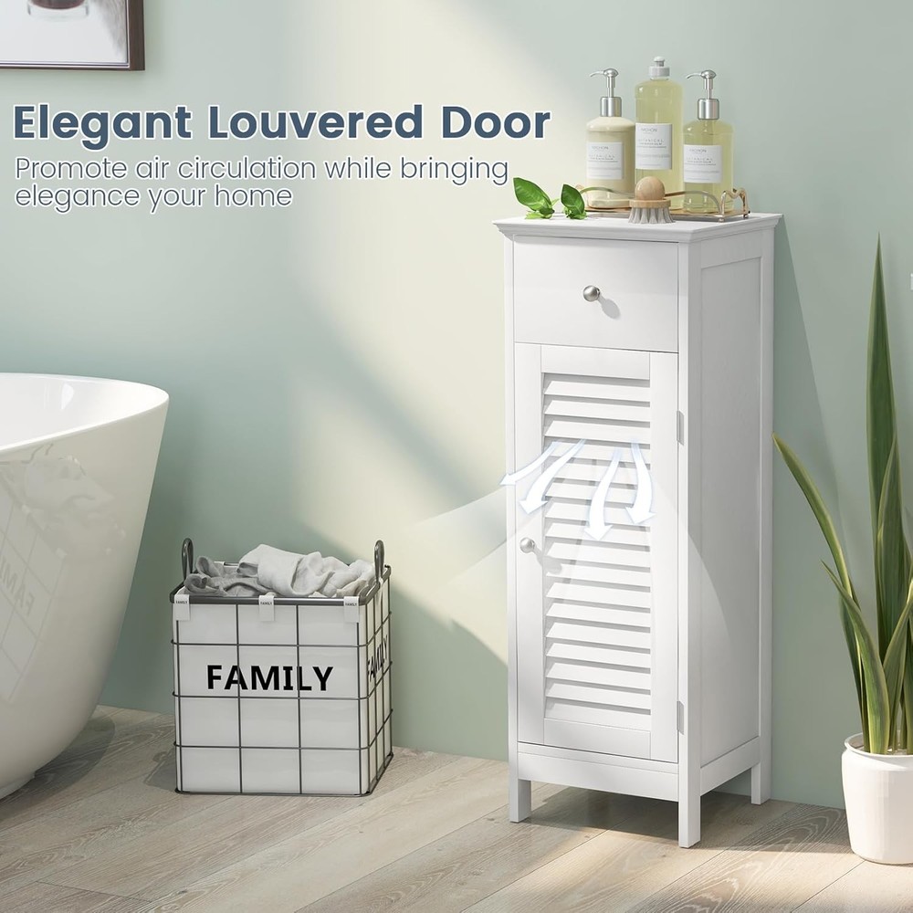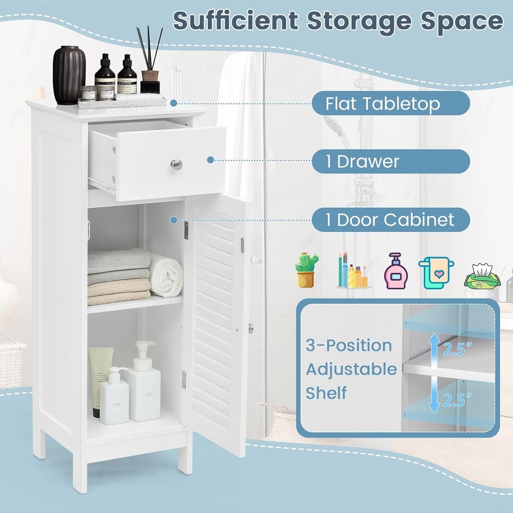 Product Description About this item [Sufficient Storage Space]: This bathroom floor cabinet can keep clutter away and make you room clean and tidy. The flat top is perfect for displaying your favorite home decor items or placing your most-used items for easy access. In addition, 1 door cabinet and 1 drawer keep towels, toiletries, books and other sundries organized. [Stability & Safety Ensured]: Made of durable MDF and engineered wood and supported by 4 stable legs with anti-slip foot pads, this storage organizer ensures great stability and durability for long term. More importantly, the floor cabinet can be fixed to the wall with the included anti-tipping device for added safety and stability. [Adjustable Shelf Design]: The 3-position adjustable shelf inside the cabinet provides large and customized storage space for items of different sizes. What’s more, additional features like the smooth drawer slide rails, exquisite round knobs and functional magnetic catch help you open the drawer and cabinet easily. [Easy Assembly & Wide Application]: With detailed instructions and simple structure, our floor cabinet is easy to assemble in a short time. With a compact size of 13" x 12" x 34.5" (L x W x H), this slim cabinet is perfect for small spaces. It can be widely used in your living room, bathroom, entryway, hallway and more. [Elegant Look & Easy Maintenance]: With smooth painted finish and polished silver knobs, this bathroom cabinet boasts timeless, classic style that adds stylish storage space to your rooms. The elegant louvered door can promote air circulation while bringing elegance your home. Moreover, the waterproof surface is easy to clean with a cloth. Something We’d Like to Share: Maximize storage and display space in your home with this single door floor cabinet. With spacious tabletop, a drawer and a cabinet, this bathroom floor cabinet is perfect for storing toiletries and towels and displaying decorative accents. This storage cabinet is designed with a single shutter door that elevates the look and but also promotes ventilation. The inner shelf is adjustable in 3 positions, ideal for storing a variety of items of different sizes. Made of premium MDF and 4 sturdy legs, this single floor cabinet ensures long-lasting use. Its modern elegant look fits into any room types and designs. This storage unit can be placed anywhere in your home – kitchen, bathroom, living room or entryway to offer additional storage space. Specifications: Color: White/Grey Material: MDF, Engineered Wood Product Dimension: 13" x 12" x 34.5" (L x W x H) Adjustable Height of Shelf: 2.5" Raised Bottom Height: 3" Net Weight: 20 lbs Package Includes: 1 x Bathroom Floor Cabinet 1 x Instruction On Aug 14, 2025 at 20:04:19 PDT, seller added the following information: