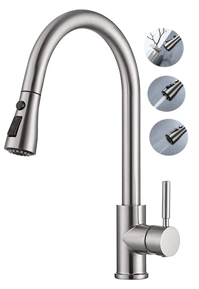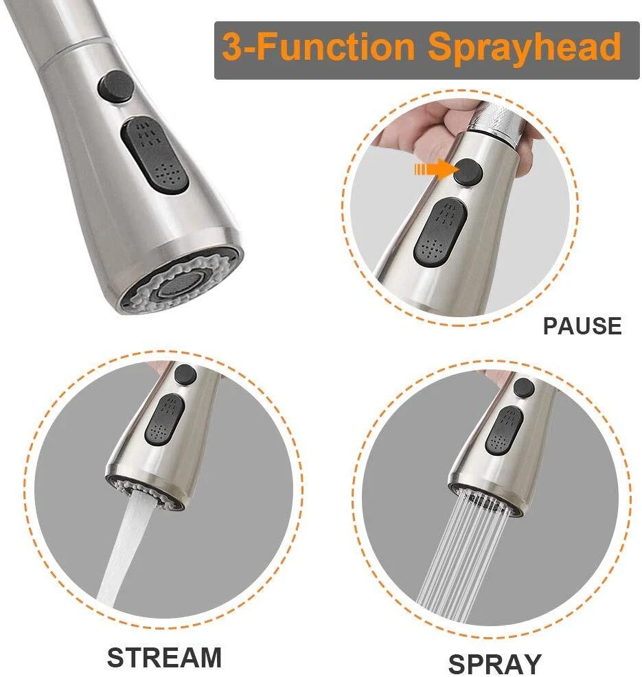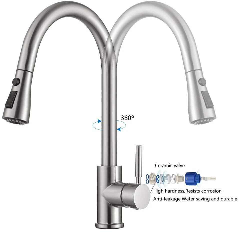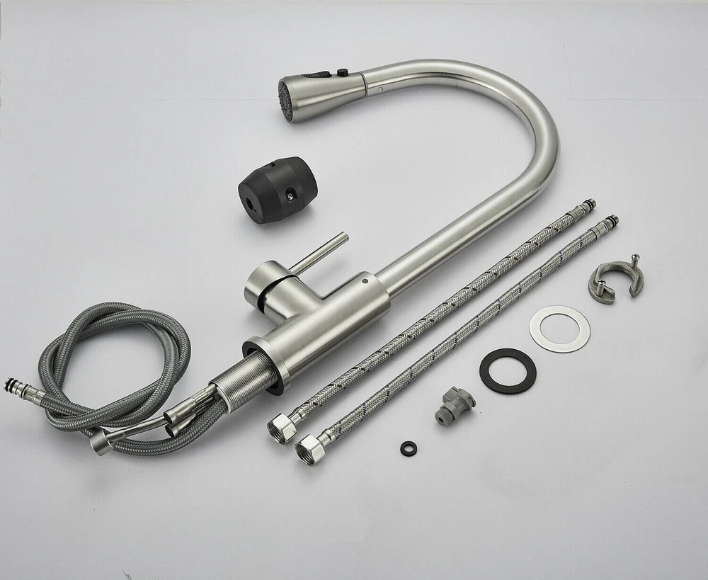 Product Description Function: Kitchen Sink Faucet Feature :Swivel Spout,pull down sprayer Finish: Brushed Nickel Number of Handles: Single Handle Installation Holes: One or Threee Holes Faucet Total Height: As picture shows Valve Type: Ceramic Valve Faucet Body Material: Stainless Steel Faucet Spout Material: ABS Faucet Handle Material: Brass With 2 pipes for cold and hot water(40cm) Water Feature:Mix Hot and Cold Water Pressures:Minimum 0.5 bar, 1.0 bar recommended Water Flow: 1.8 GPM 5 Years warranty Safety first - all bathroom faucet and commercial faucets designed for drinking water use are fully compliant with the latest federal and state lead-free standards Easy to install. Swivel Spout can make the faucet fit for double bowl kitchen sink This is a multi-attribute link, we will ship according to your choice, please choose the option you want before buying! Payment Only PayPal is Accepted. Immediately payment is required after the Winning Bid or Buy it Now Shipping Usually shipment can be arranged within 1 working days after receiving payment. We usually ship by Fedex ,UPS,China Post. Usually the delivery time is 7-20 days. Remote areas will needs extra shipping cost and more time. We ship according to the address on PayPal. (After you make the payment, PayPal will send us an email automatically, informing us the payment and shipping address.) So please make sure your address on PayPal is the right one.We do not ship to PO.BOX address Mail transit time is best estimated, but not guaranteed. As transit time varies. Contact us Shipping damage has to be reported within 7 business days of which the product was delivered. If you have any questions, please be free to contact with us by eBay massage,we will answer your questions ASAP. Feedback I describe items as well as I can. If I have missed something, please let me know. Please e-mail me before leaving feedback if you are unhappy with your item, so we can work it out. International Buyers – Please Note: Import duties, taxes, and charges are not included in the item price or shipping cost. On Jun-05-21 at 02:34:11 PDT, seller added the following information: ????? We hope our products and our service can give you a wonderful experience ?????