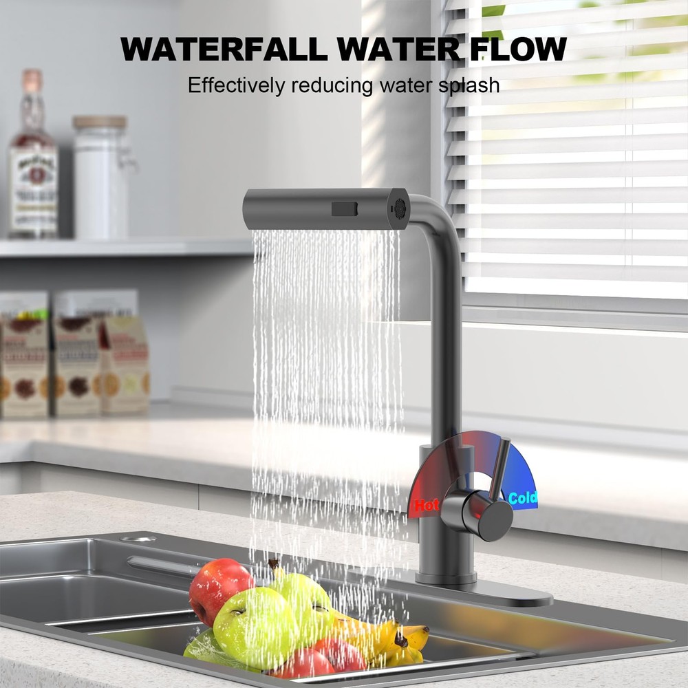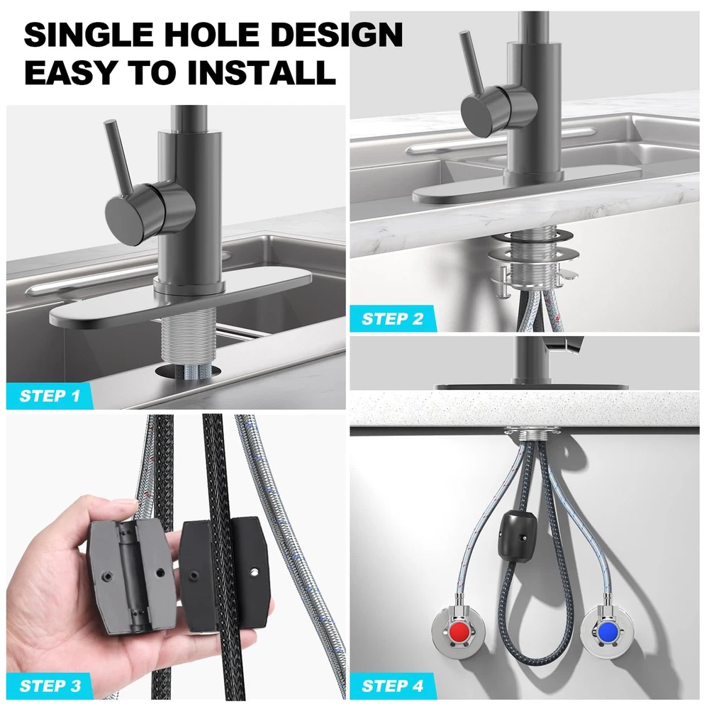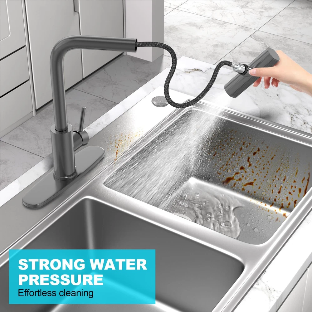 Elevate Your Kitchen Experience with the Pull-Out kitchen faucet At , we believe the heart of every home is the kitchen, and weโre here to help you transform it into your personal culinary haven. Our pullout kitchen faucet is designed to bring professional kitchen functionality into your home, providing you with tools to create and clean with ease. Crafted with precision, this faucet ensures optimal performance and lasting beauty. A Professional Solution for Your Kitchen Inspired by the design of top-tier kitchens, the bar sink faucets features a uniquely designed spray head for exceptional control and flexibility. Whether you're preparing a gourmet meal or cleaning up after a family dinner, the innovative 3-function spray head (sweep, stream, and waterfall) makes every task easier, from washing dishes to rinsing produce. Built for Durability We know that kitchens are busy places, which is why we've engineered this faucet to withstand the toughest daily use. With scratch shield technology, it maintains its sleek appearance even through the most demanding tasks. The detachable spray head makes it easy to clean and keep looking as good as new. Effortless Installation and Lasting Performance Designed for DIY installation, the bar sink faucet single hole comes with flexible hoses and quick-connect fittings to make setup a breeze, ensuring you enjoy a of reliable, durable performance. Whatโs Included 1 x kitchen faucet pull down 1 x Deck Plate Enhance your kitchen's functionality with the Pull-Out Faucetโwhere professional design meets lasting durability. ๐ง๐๐จ๐ง๐ฏ๐๐ง๐ข๐๐ง๐ญ ๐๐ฎ๐ฅ๐ฅ-๐๐จ๐ฐ๐ง ๐๐ฉ๐ซ๐๐ฒ๐๐ซ: The 14-inch pull-down sprayer makes rinsing dishes, washing food, and cleaning countertops effortless. The faucet for kitchen sink perfect for filling deep pots or large containers. Enjoy precise water control and increased efficiency in your daily tasks. ๐๐-๐๐จ๐๐ ๐๐ฉ๐ซ๐๐ฒ ๐๐ฐ๐ข๐ญ๐๐ก๐ข๐ง๐ : Switch between three spray modesโSweep, Stream, and Waterfall. Use Sweep for powerful, wide coverage; Stream for precise water flow; and Waterfall for a gentle, elegant flow. Perfect for rinsing dishes, washing vegetables, or cleaning larger containers with ease. ๐ ๏ธ๐๐๐๐จ๐ซ๐ญ๐ฅ๐๐ฌ๐ฌ & ๐๐ฎ๐ข๐๐ค ๐๐ง๐ฌ๐ญ๐๐ฅ๐ฅ๐๐ญ๐ข๐จ๐ง: Install your kitchen faucets in under 25 minutesโno plumber required! All necessary parts are included, and clear instructions make it simple. It fits single-hole and three-hole sinks (deck plate included), saving you both time and money. ๐๐๐ฎ๐ซ๐๐๐ฅ๐ ๐๐๐ ๐๐ญ๐๐ข๐ง๐ฅ๐๐ฌ๐ฌ ๐๐ญ๐๐๐ฅ: Made from food-safe 304 stainless steel, this pull down kitchen faucet offers excellent corrosion and wear resistance for a longer lifespan. Its anti-fingerprint and easy-clean features ensure convenient maintenance, making it a reliable and stylish addition to your kitchen. โ๐๐ข๐ฆ๐ฉ๐ฅ๐ ๐๐ง๐-๐๐๐ง๐ ๐๐ฉ๐๐ซ๐๐ญ๐ข๐จ๐ง: The ergonomic single handle design allows easy control of both water flow and temperature with one hand. This Touch on kitchen sink faucets makes multitasking effortless, helping you save time and making kitchen tasks smoother. Ideal for all family members, young or old. ๐ฆ๐๐จ ๐๐๐๐ค ๐๐๐ซ๐๐ฆ๐ข๐ ๐๐๐ฅ๐ฏ๐: Built with a premium ceramic cartridge and precise seals, our faucet for kitchen a leak-free experience. With over 500,000 successful tests, you can trust this dependable kitchen fixture to ensure a more comfortable life. ๐ค๐๐ญ๐ฒ๐ฅ๐ข๐ฌ๐ก ๐๐ซ๐๐ฒ ๐ ๐ข๐ง๐ข๐ฌ๐ก: The modern, sleek single hole kitchen faucet's enhances the look of any kitchen, from modern to classic styles. Its clean, minimalist design fits seamlessly into both small and large sinks, adding a touch of sophistication to your space. ๐งผ๐๐๐ฌ๐ฒ ๐๐ข๐ฉ๐, ๐๐ฅ๐ฐ๐๐ฒ๐ฌ ๐ ๐ซ๐๐ฌ๐ก: The single handle kitchen faucetโs fingerprint-resistant surface ensures it stays looking pristine with minimal effort. Simply wipe it down with a soft cloth to keep it free from water spots and smudges, making maintenance quick and easy for a consistently clean sink area.