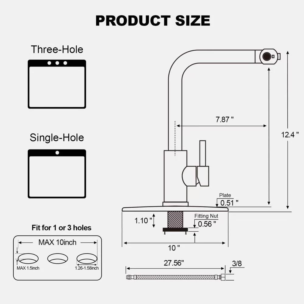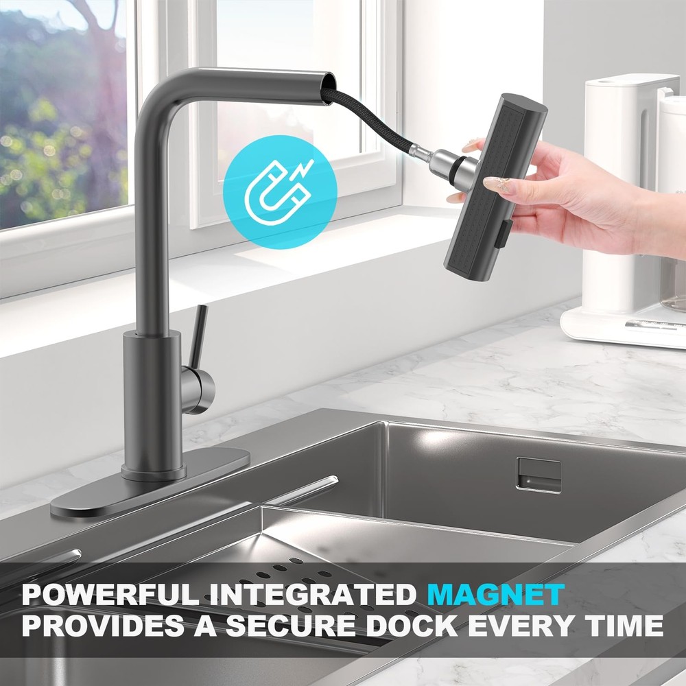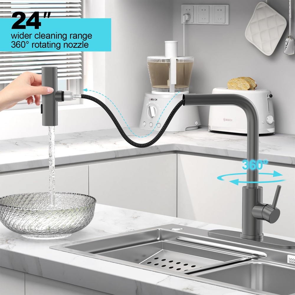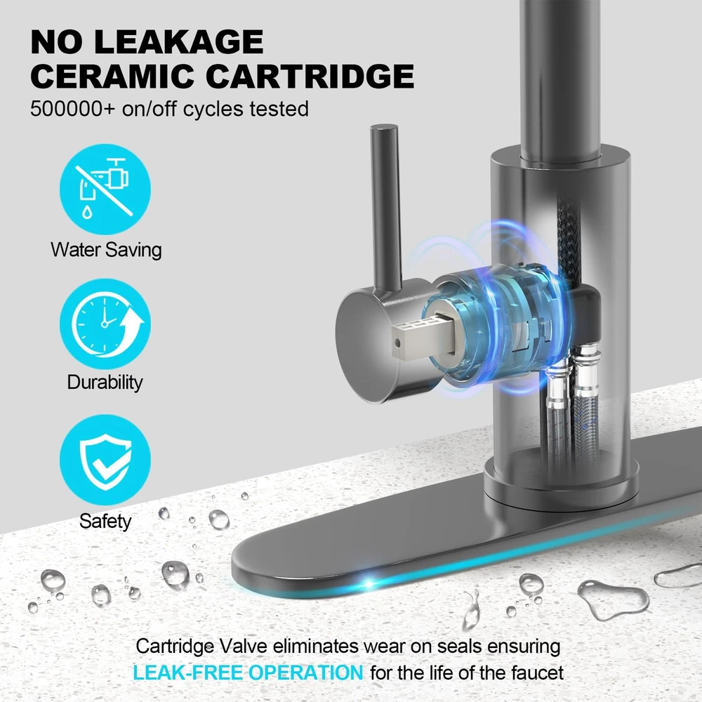 Elevate Your Kitchen Experience with the Pull-Out kitchen faucet At , we believe the heart of every home is the kitchen, and weโre here to help you transform it into your personal culinary haven. Our pullout kitchen faucet is designed to bring professional kitchen functionality into your home, providing you with tools to create and clean with ease. Crafted with precision, this faucet ensures optimal performance and lasting beauty. A Professional Solution for Your Kitchen Inspired by the design of top-tier kitchens, the bar sink faucets features a uniquely designed spray head for exceptional control and flexibility. Whether you're preparing a gourmet meal or cleaning up after a family dinner, the innovative 3-function spray head (sweep, stream, and waterfall) makes every task easier, from washing dishes to rinsing produce. Built for Durability We know that kitchens are busy places, which is why we've engineered this faucet to withstand the toughest daily use. With scratch shield technology, it maintains its sleek appearance even through the most demanding tasks. The detachable spray head makes it easy to clean and keep looking as good as new. Effortless Installation and Lasting Performance Designed for DIY installation, the bar sink faucet single hole comes with flexible hoses and quick-connect fittings to make setup a breeze, ensuring you enjoy a of reliable, durable performance. Whatโs Included 1 x kitchen faucet pull down 1 x Deck Plate Enhance your kitchen's functionality with the Pull-Out Faucetโwhere professional design meets lasting durability. ๐ง๐๐จ๐ง๐ฏ๐๐ง๐ข๐๐ง๐ญ ๐๐ฎ๐ฅ๐ฅ-๐๐จ๐ฐ๐ง ๐๐ฉ๐ซ๐๐ฒ๐๐ซ: The 14-inch pull-down sprayer makes rinsing dishes, washing food, and cleaning countertops effortless. The faucet for kitchen sink perfect for filling deep pots or large containers. Enjoy precise water control and increased efficiency in your daily tasks. ๐๐-๐๐จ๐๐ ๐๐ฉ๐ซ๐๐ฒ ๐๐ฐ๐ข๐ญ๐๐ก๐ข๐ง๐ : Switch between three spray modesโSweep, Stream, and Waterfall. Use Sweep for powerful, wide coverage; Stream for precise water flow; and Waterfall for a gentle, elegant flow. Perfect for rinsing dishes, washing vegetables, or cleaning larger containers with ease. ๐ ๏ธ๐๐๐๐จ๐ซ๐ญ๐ฅ๐๐ฌ๐ฌ & ๐๐ฎ๐ข๐๐ค ๐๐ง๐ฌ๐ญ๐๐ฅ๐ฅ๐๐ญ๐ข๐จ๐ง: Install your kitchen faucets in under 25 minutesโno plumber required! All necessary parts are included, and clear instructions make it simple. It fits single-hole and three-hole sinks (deck plate included), saving you both time and money. ๐๐๐ฎ๐ซ๐๐๐ฅ๐ ๐๐๐ ๐๐ญ๐๐ข๐ง๐ฅ๐๐ฌ๐ฌ ๐๐ญ๐๐๐ฅ: Made from food-safe 304 stainless steel, this pull down kitchen faucet offers excellent corrosion and wear resistance for a longer lifespan. Its anti-fingerprint and easy-clean features ensure convenient maintenance, making it a reliable and stylish addition to your kitchen. โ๐๐ข๐ฆ๐ฉ๐ฅ๐ ๐๐ง๐-๐๐๐ง๐ ๐๐ฉ๐๐ซ๐๐ญ๐ข๐จ๐ง: The ergonomic single handle design allows easy control of both water flow and temperature with one hand. This Touch on kitchen sink faucets makes multitasking effortless, helping you save time and making kitchen tasks smoother. Ideal for all family members, young or old. ๐ฆ๐๐จ ๐๐๐๐ค ๐๐๐ซ๐๐ฆ๐ข๐ ๐๐๐ฅ๐ฏ๐: Built with a premium ceramic cartridge and precise seals, our faucet for kitchen a leak-free experience. With over 500,000 successful tests, you can trust this dependable kitchen fixture to ensure a more comfortable life. ๐ค๐๐ญ๐ฒ๐ฅ๐ข๐ฌ๐ก ๐๐ซ๐๐ฒ ๐ ๐ข๐ง๐ข๐ฌ๐ก: The modern, sleek single hole kitchen faucet's enhances the look of any kitchen, from modern to classic styles. Its clean, minimalist design fits seamlessly into both small and large sinks, adding a touch of sophistication to your space. ๐งผ๐๐๐ฌ๐ฒ ๐๐ข๐ฉ๐, ๐๐ฅ๐ฐ๐๐ฒ๐ฌ ๐ ๐ซ๐๐ฌ๐ก: The single handle kitchen faucetโs fingerprint-resistant surface ensures it stays looking pristine with minimal effort. Simply wipe it down with a soft cloth to keep it free from water spots and smudges, making maintenance quick and easy for a consistently clean sink area.