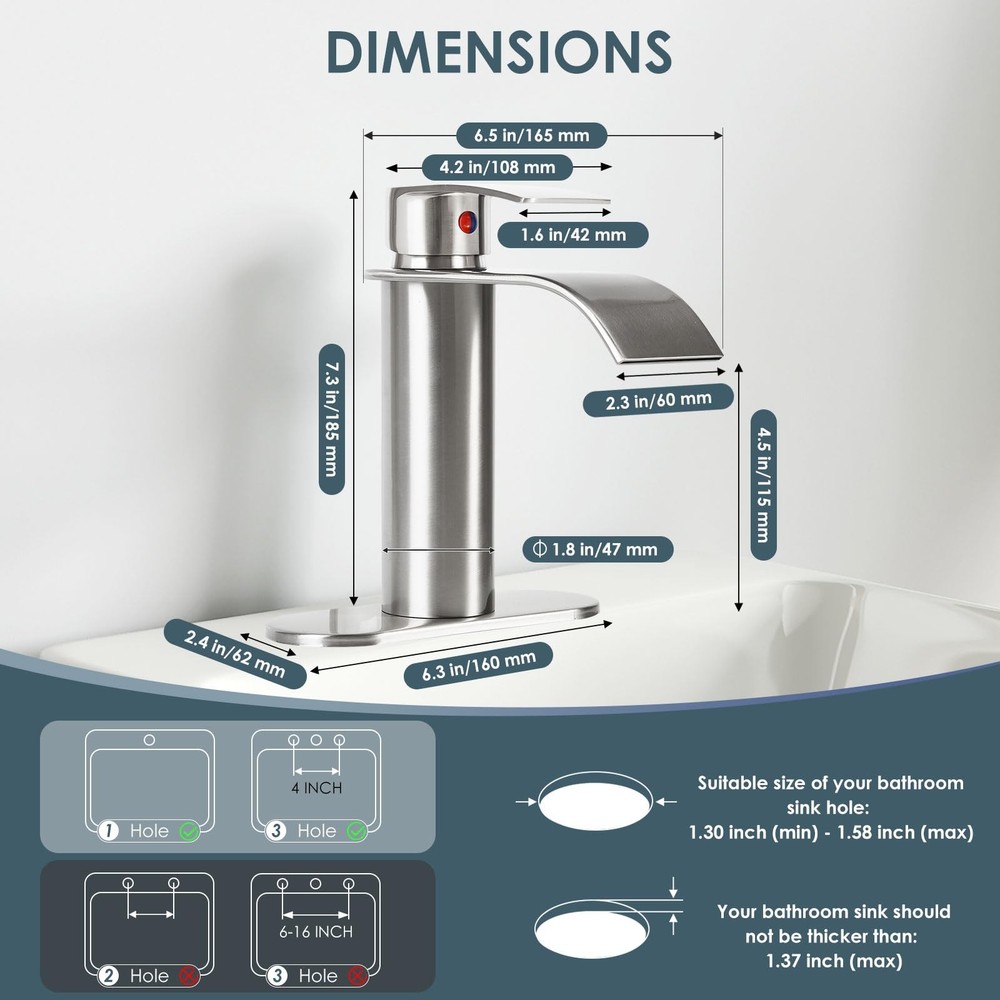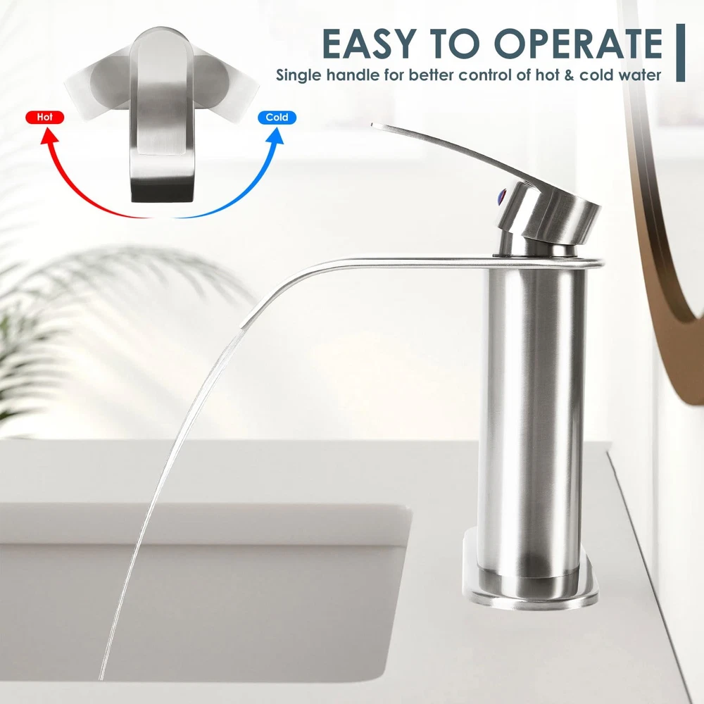 This elegant single-handle waterfall spout bathroom sink faucet from provides a stylish addition to any vanity. Featuring a 4-inch centerset design, its streamlined silhouette is a modern take on traditional plumbing fixtures. Smooth operation allows you to control temperature and flow with a single lever. The high arching spout creates a gentle waterfall effect that reduces splashing while filling sinks and basins. Made of 304 stainless steel construction with brass waterway & durable ceramic disc cartridges, it promises long-lasting performance you can count on. Easy installation options fit one or three hole (4 inch) configurations. Finished in spot-resistant electroplated, this lavatory faucet is a low maintenance choice that keeps your bathroom looking new for years to come. ELEGANT STYLING: This single handle waterfall spout faucet features a sleek electroplate finish and minimalist design that enhances any scenes, such as bathroom sink, bar sink, vanity sink, lavatory sink, restroom sink. SINGLE HANDLE CONTROL: Our faucet adopt single lever handle, which can help our users easily adjust to the appropriate water flow and temperature. WATERFALL SPOUT DESIGN & WATER-SAVING: Streamlined waterfall spout which help you create a quiet bathroom environment. With exquisite workmanship, our bathroom waterfall faucet running with no splash, and thus saves water usage. PREMIUM MATERIAL: Constructed of lead-free 304 stainless steel & brass that has undergone rigorous testing for durability and compliance with US plumbing standards. EASY INSTALLATION: Our faucet including all mounting accessories (Pop up drain included), meanwhile, we prepare 6.3 inch deck plate which compatible with 1 or 3 hole (4 inch spread) sink , just bring your own wrench DIY with 30 minutes, without plumbing experience required.