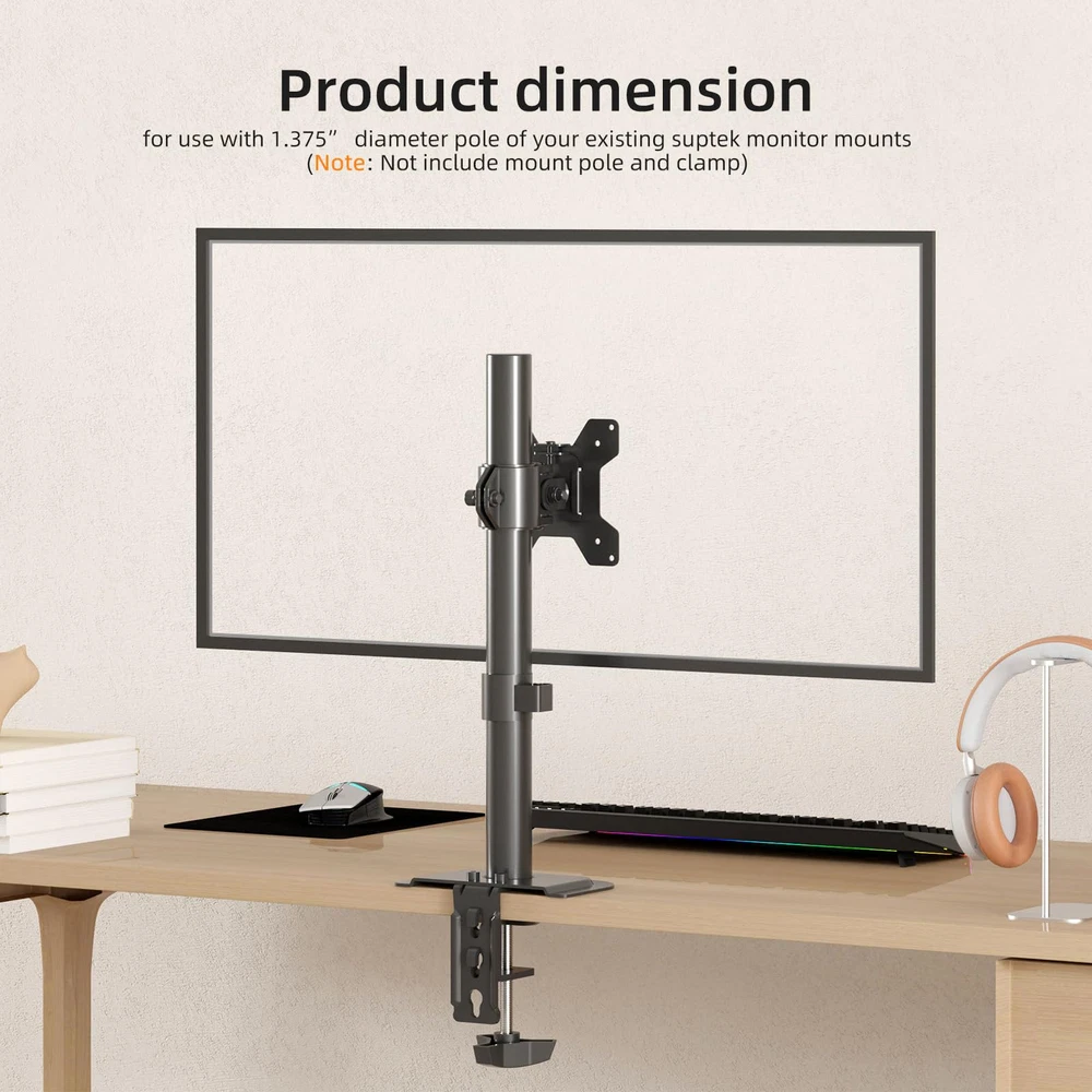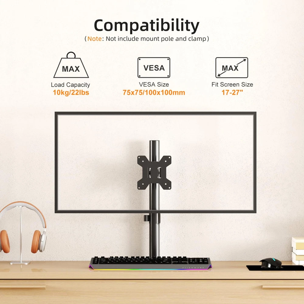 Compatibility: The vesa pole mount bracket fit most desk monitor mount and stand,fit 1.375” (3.5cm) diameter center pole.Fit monitor up to 27”, 10kgs/22lbs and Mounting Holes size 75x75mm and 100x100mm ±90° tilt,360° rotation make this monitor pole mount bracket fully adjustable. What you need for installation this head sleeve is all included in the package. Please us for sure if you have any questions about it.