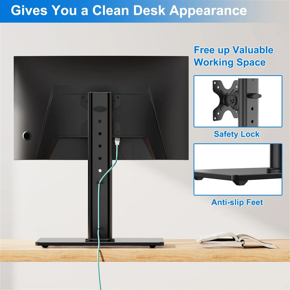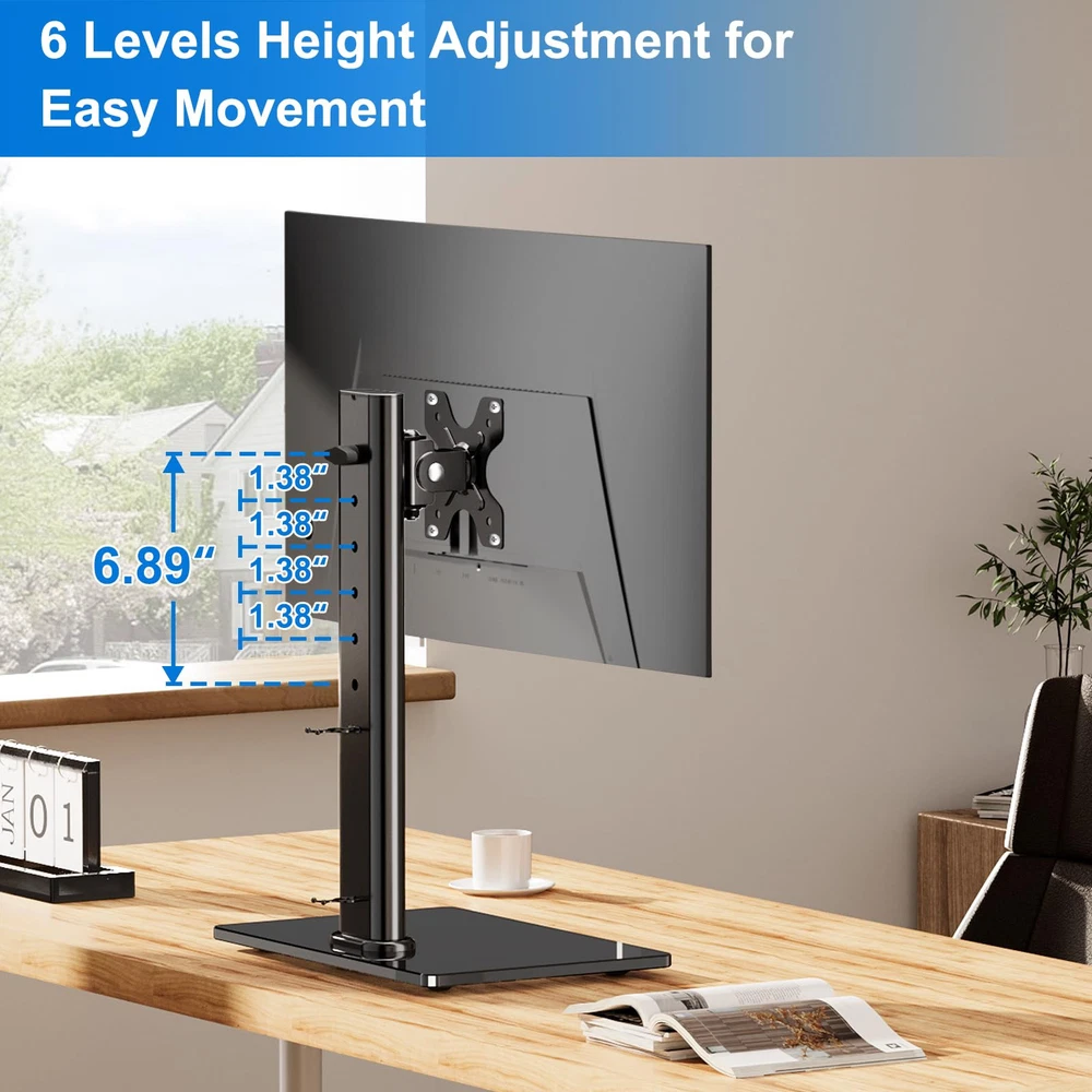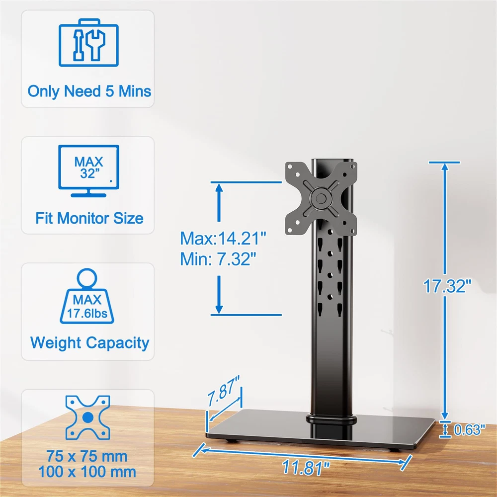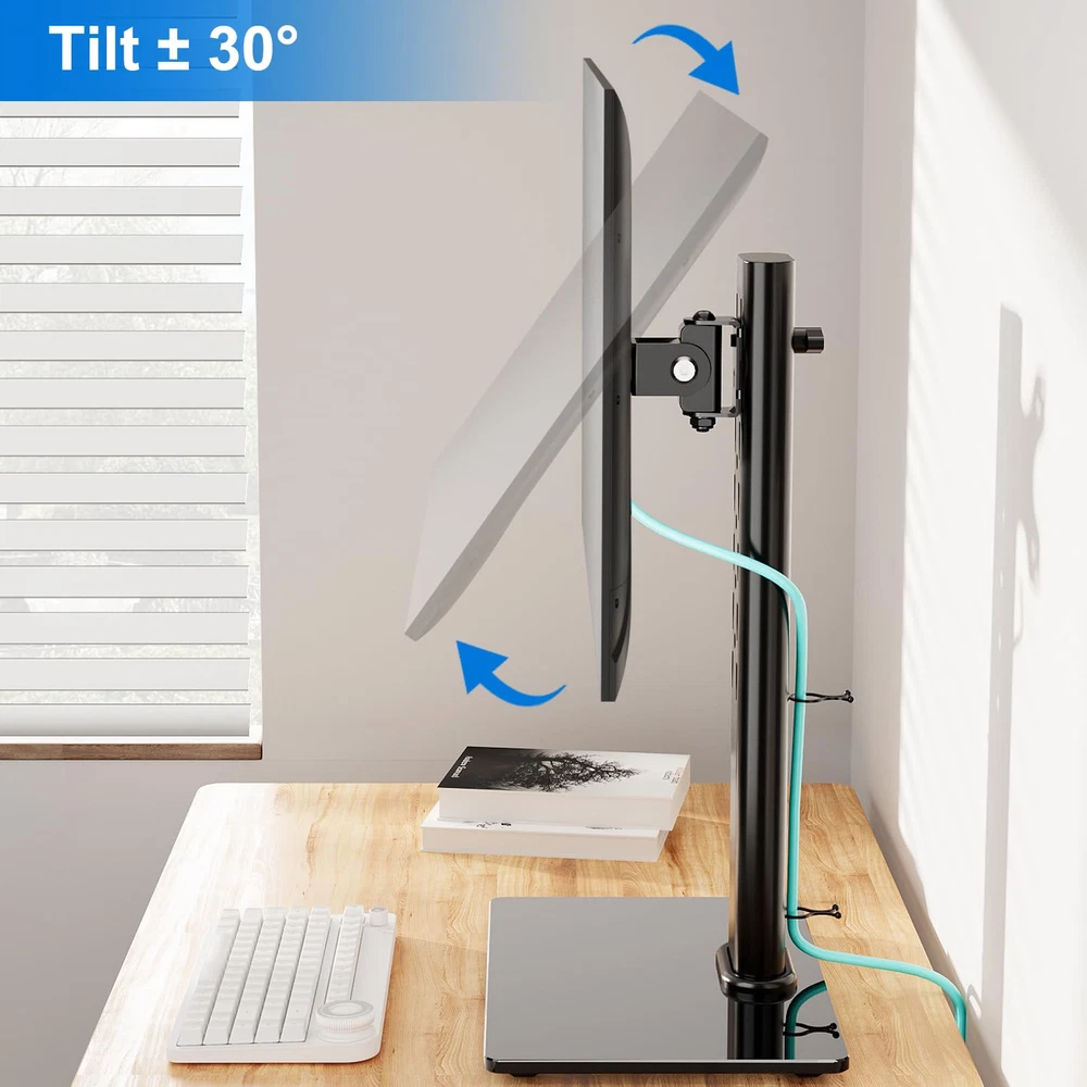 Universal Compatibility - single monitor stand holds 13,15,17,19,21,23,27,30 and 32 inch LCD LED flat or curved screens, supports up to 17.6 lbs, compatible with VESA patterns 75x75 mm and 100x100 mm. Designed with a solid tempered glass base that holds your monitor securely and steadily on your desktop Ergonomic Design - Comes with adjustable bracket offering tilt +30°/- 30°, swivel +45°/- 45°, rotation 360°, and height adjustment up to 6.89" to fit different sitting or standing positions. The free-standing design is more convenient and no need for drilling any grommet hole or using any clamp.VESA mount offers improved viewing comfort for you Free up more workspace - It's time to say goodbye to messy desktops! This single monitor stand comes with cable management to keep cords clean and organized. It also lift your monitor away from your desktop, freeing up valuable space for other items and making your desk neater and visually more comfortable. And with foot pads to prevent skidding while protecting the desk from scratches Healthy Working Style - This single monitor stand raises monitors to eye level, improving posture, correcting your working posture. Every small step you take will be the foundation for a healthy lifestyle Effortless Assembly - Easy to install within 10 mins without any hassle and comes with an instruction.We provide all the necessary hardware and instructions for simple assembly. Please feel free to contact us with any questions