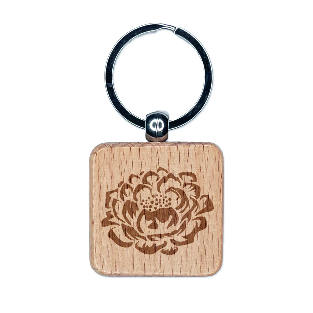 Single Peony Flower Engraved Wood Square Keychain Tag Charm