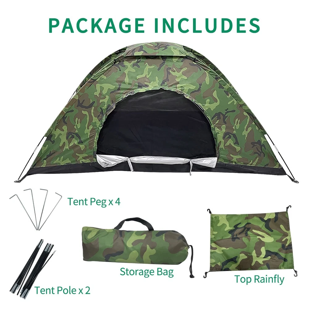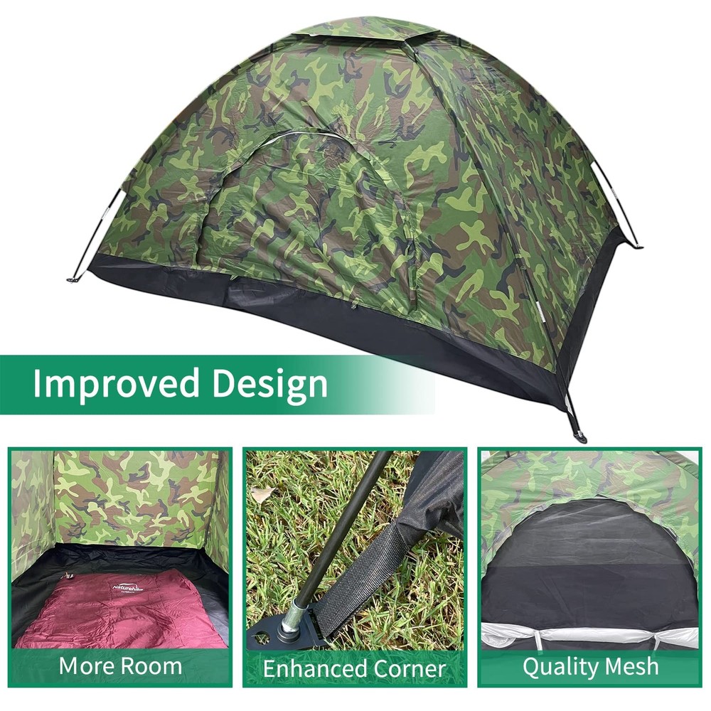 We heared your voice! Upgraded Tent - material, size, durability, and function have been improved! [Material]: Bottom sheet is made of 210D nylon fabric, water pressure resistant up to 5FT. Camouflage fabric is made of 210T Oxford. [Large Space]: Much More Space! Single Tent Size: 82.6"L x 35.4" W x 39.3" H / 210cm L x 90cm W x 100cmH. Double Tent Size: 82.6" L x 55" W x 41.3" H / 210cm L x 140cm W x 105cm H [Function]: Added top hanging hook is convenient for hanging lantern. Stronger nylon mesh is used for the entrance and ceiling, with excellent ventilation. [Portability]: Single tent weighs approx. 3lbs, Double tent weighs ~4lbs. Easy to install and carry. Can fit into your backpack. Perfect for backpacking, camping, bicycle & motorcycle touring, musical festivals, beaches, mountain climbing and other outdoor activities. Please feel free to contact us if you are not happy with the tent, we will provide you a satisfied solution.