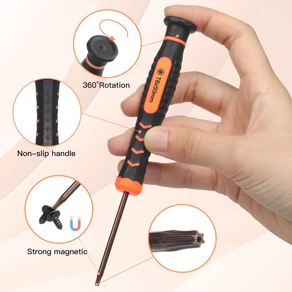 This screwdriver set is a lifesaver for fixing gadgets! The magnetic T8 security bit works perfectly on game consoles, laptops, and phones, while the double-end pry tool makes opening devices a breeze. The sturdy S2 steel tips grip screws tightly, and the compact size is super convenient. Great quality at an affordable price—highly recommend for DIY repairs!