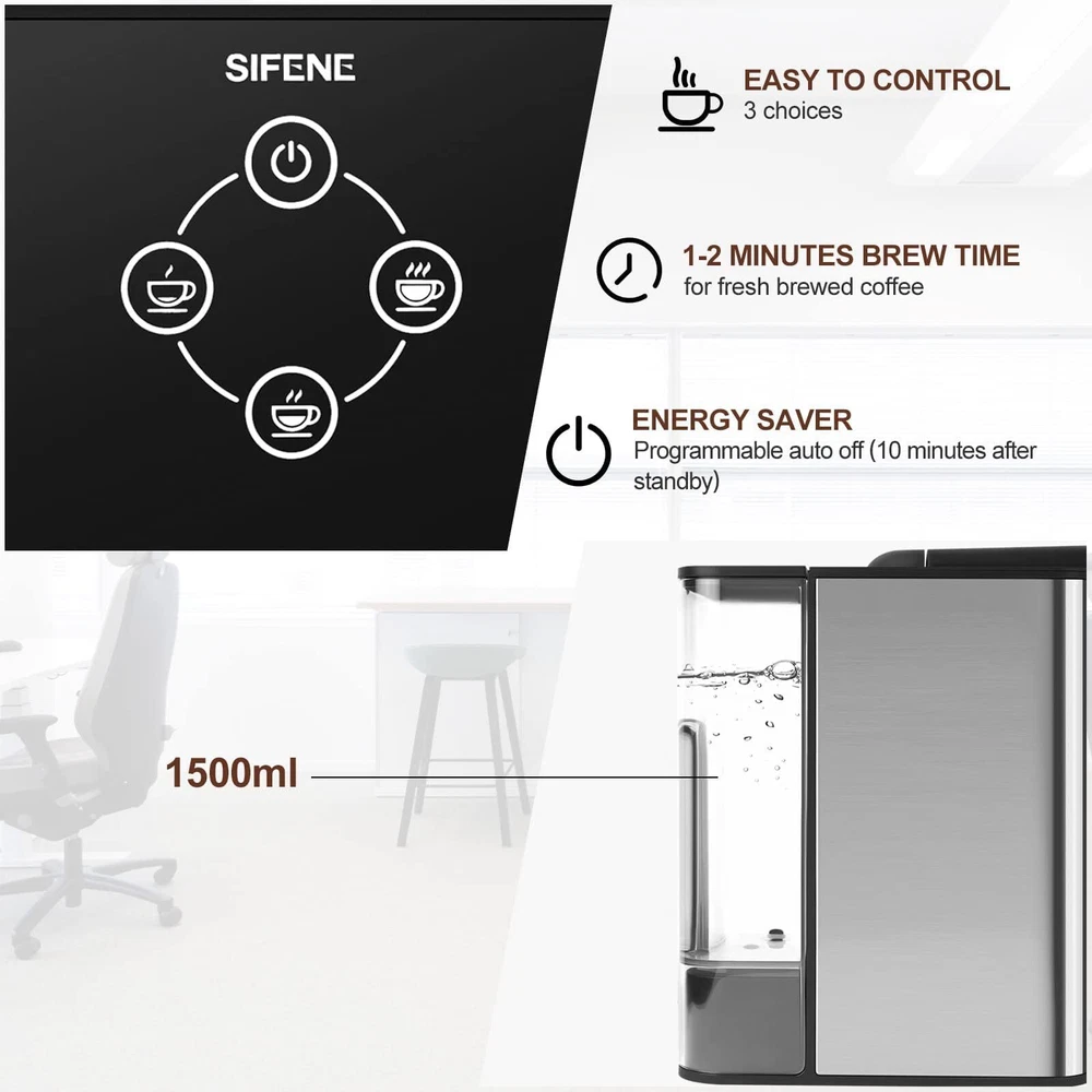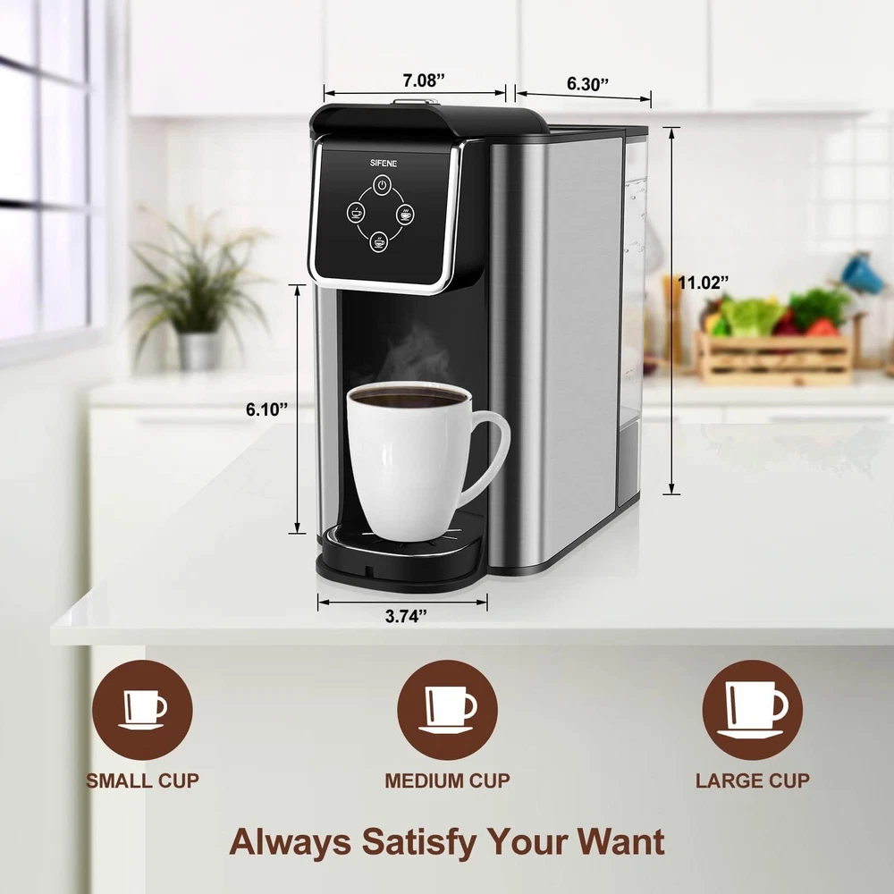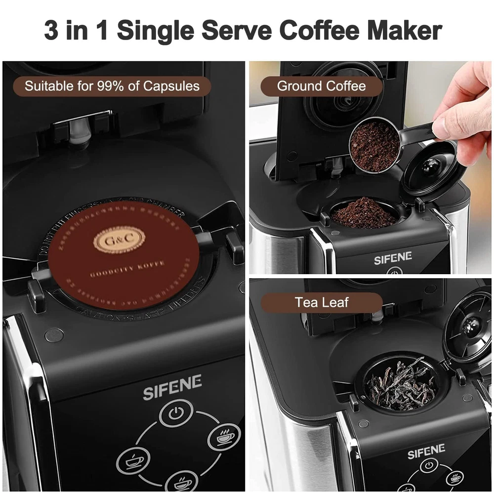 Enjoy the perfect, full bodied and flavorful cup of coffee with the Single Serve Coffee Maker with Water Tank using your favorite ground coffee or capsule. Enjoy maximum brewing flexibility with 3 different serving sizes: 6 oz, 8 oz or 10oz. The large 50oz removable water reservoir conveniently allows you to brew several cups without refilling the unit every time. K-CUP COMPATIBLE: Brews pods coffee(compatible 99% capsules including 2.0) or coffee grounds. Reusable filter for ground coffee and pods compatible holder included MAXIMUM FLAVOR: Water stream adjusts for ground coffee to ensure full bodied brew and pressurized pump ensures maximum flavour extraction CONVENIENT: Automatic shut off for added safety and convenience CUSTOMER SUPPORT: We strive to provide unmatched customer service & support. If you are not satisfied with our products or have quality problems, please contact us and we guarantee free Replacement or a Full refund promptly. 【3 in 1 Coffee Maker】The coffee machine brews tea, ground coffee, and accommodates most coffee capsules, serving as your ultimate kitchen or office companion. 【Brew in Seconds】Experience precise, quick brewing with this single cup coffee maker. Brew a 6, 8, or 10 oz. cup with a button press and enjoy your coffee in just 60 to 100 seconds. 【Tea-Time Simplified】Brew your favorite loose leaf tea in minutes with this coffee and tea maker's 3 filters. Say farewell to the traditional kettle. 【Easy to Clean】The single serve coffee maker is designed for easy cleaning, with removable parts that can be washed in the dishwasher. 【Space-Saving Design】 With its compact and travel-friendly dimensions (6.3" W x 10.6" H) and a 50 fl oz reservoir capacity (up to 8 cups), you can fit the coffee maker anywhere in your kitchen or take it on your trips. It’s designed to accommodate cups up to 3.7" W and 6.3" H, making it suitable for every coffee lover.