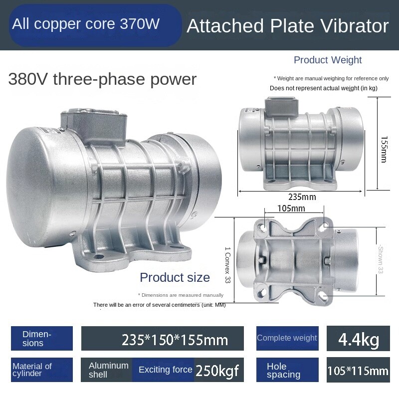 Attached Slab Vibrator Single-phase Three-phase Vibrator Cement Slab Concrete 【 All copper motor 】0.25KW380V/220V (no base plate) Size: 235*150*155mm Cylinder material: aluminum shell exciting force 180kgf Hole distance: 105*115mm Total weight: 4kg 【 All copper motor 】0.37KW380V/220V (no base plate) Size: 235*150*155mm Cylinder material: aluminum shell excitation force 250kgf Hole distance: 105*115mm Total weight: 4.4kg