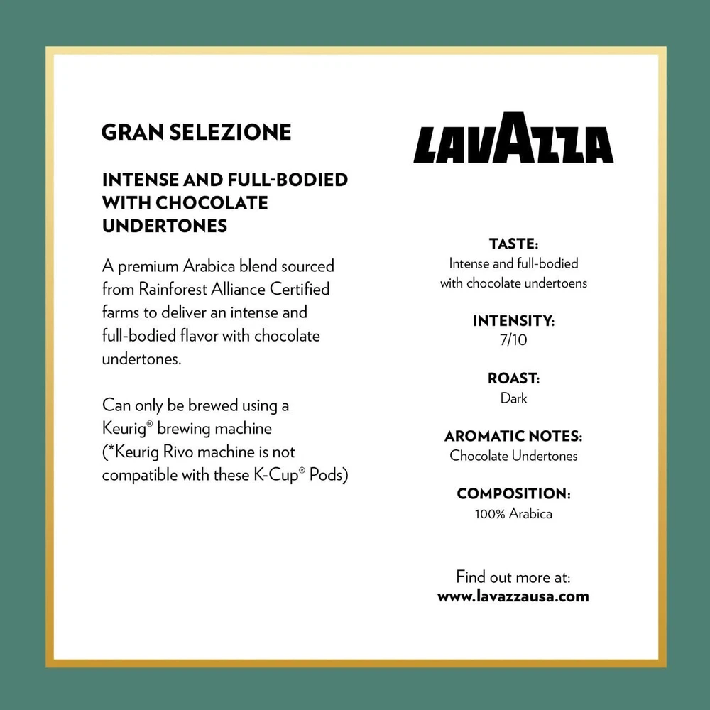 No matter how you take your coffee, has a blend and preparation to perfectly fit into your coffee ritual. Four generations of the family have dedicated over 125 years to sourcing the best blends of coffee beans from all over the world to bring you an unmistakable taste and aroma that is uniquely . Our Gran Selezione ground coffee blend is no exception. A mix of Rainforest Alliance Certified Central and South American Arabica varieties create an intense dark roast with bold flavor. You’ll taste hints of chocolate with every full-bodied sip. This blend creates a delightfully sippable cup of coffee quickly using a Keurig® Brewer. Enjoy a premium experience where every small moment can be savored. Keurig and K-Cup are trademarks of Keurig Green Mountain, Inc., used with permission. 100% Arabica, Rainforest Alliance Certified 100% sustainably grown Full bodied dark roast with rich flavor and notes of dried fruit Blended and roasted in Italy Single-serve K-Cups with the Gran Selezione coffee blend (pack of 32 K-Cup Pods)