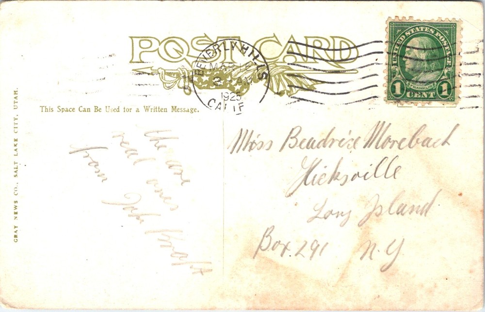 Sioux Chief Hollow Horn Bear Traditional Native American Indian Postcard 24197 Front of Postcard: The image is a historical photograph or illustration of Hollow Horn Bear, a Sioux Indian. The individual is dressed in traditional Native American attire, which includes a detailed and colorful garment adorned with intricate patterns and fringes. The garment features red, blue, and yellow designs, and the individual is also wearing a necklace and a feathered headdress. The text at the bottom of the image reads "HOLLOW HORN BEAR (SIOUX INDIAN)." There is also a copyright notice at the bottom right corner that reads "COPYRIGHT, 1903, BY WILLIAMSON-HAFNER CO. DENVER, COLO." The number "1621" is printed in the bottom right corner. This depiction captures the cultural significance and traditional attire of Hollow Horn Bear, providing a valuable historical insight. Back of Postcard: The image shows the back of a vintage postcard. The postcard is addressed to "Miss Beatrice Morebach, Hicksville, Long Island, Box 291, N.Y." There is a green one-cent United States postage stamp featuring Benjamin Franklin in the top right corner. The stamp is postmarked with a circular stamp that reads "Los Angeles, Calif, 1925." The left side of the postcard has a printed message that says, "This Space Can Be Used for a Written Message." Below this message, there is a handwritten note that appears to say, "We are well and happy. From John and Mary." The postcard is printed by "Gray News Co., Salt Lake City, Utah," as indicated on the left edge. This piece provides a fascinating glimpse into historical communication.