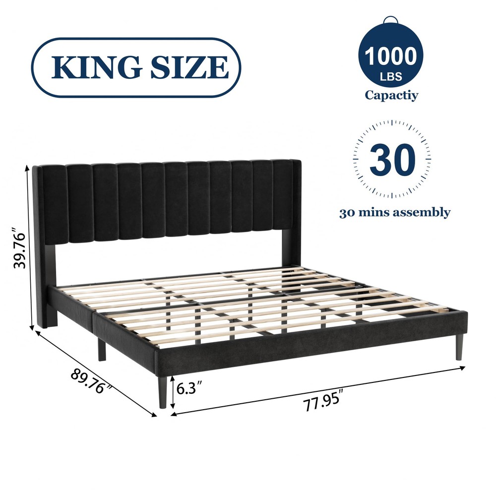 LUXURY WING BACK: Wide backrest design provides unrivaled stability, prevents pillows from slipping, and supports your head and shoulders as you lean against the headboard. Sturdy & Resistant: Made with a sturdy high-quality metal frame and center support legs blend naturally into the sturdy frame to provide dense and strong support. Weight capacity: 1000 Lbs. Thoughtful Design: 6" under-bed storage space is perfect for storing extra odds and ends. The sound-quieting features of the foot pads and sound-absorbing foam ensure a good night’s sleep. No Box Spring Needed: Durable velcro wooden slats are designed to support and extend the life of your latex, memory foam, or spring mattress. Mattress thickness recommended being 8"-12". Quick Setup: Easy to assemble in about 30 minutes, enjoy a hassle-free installation with no additional tools or springs.