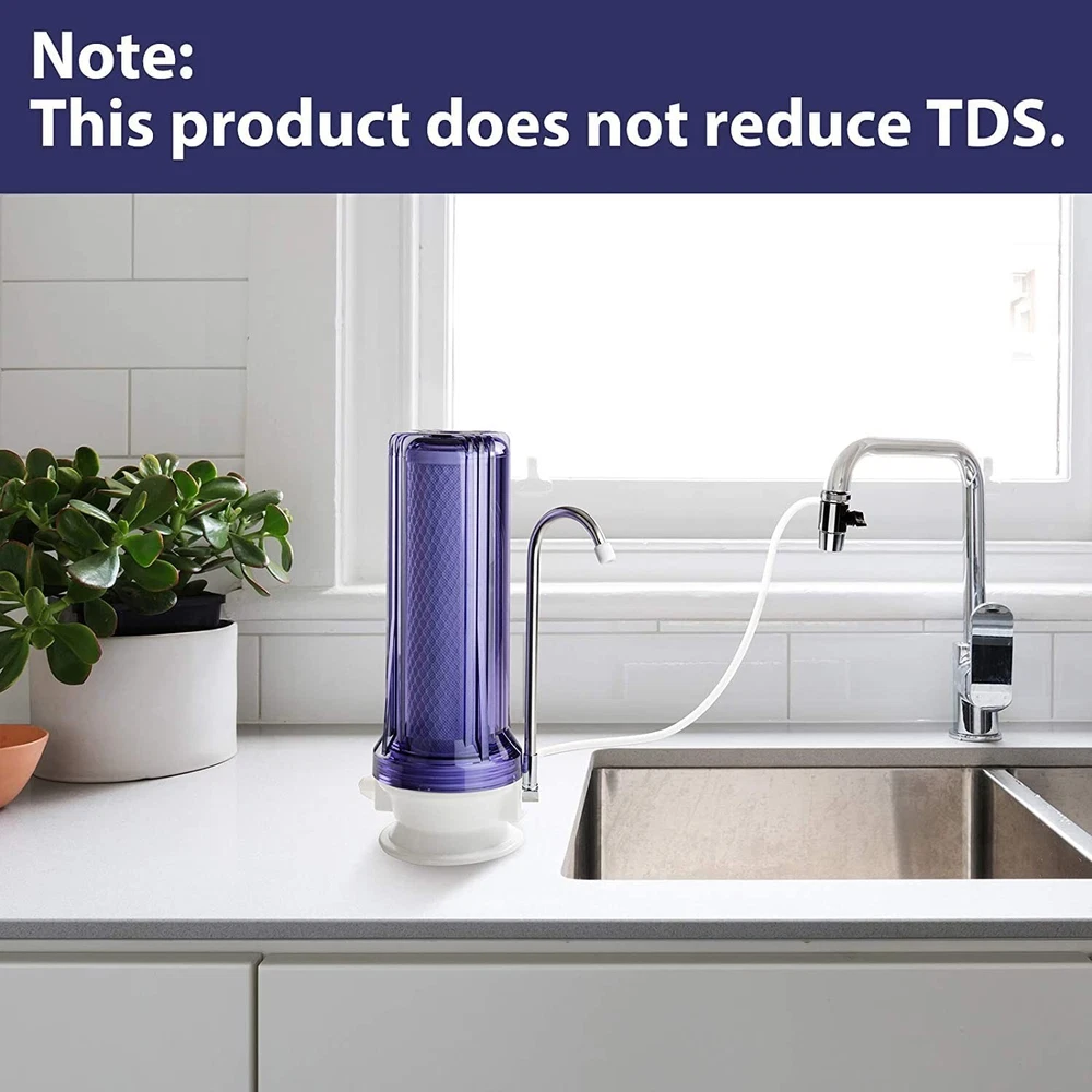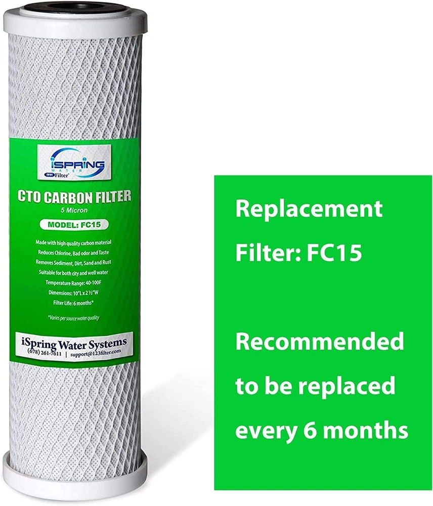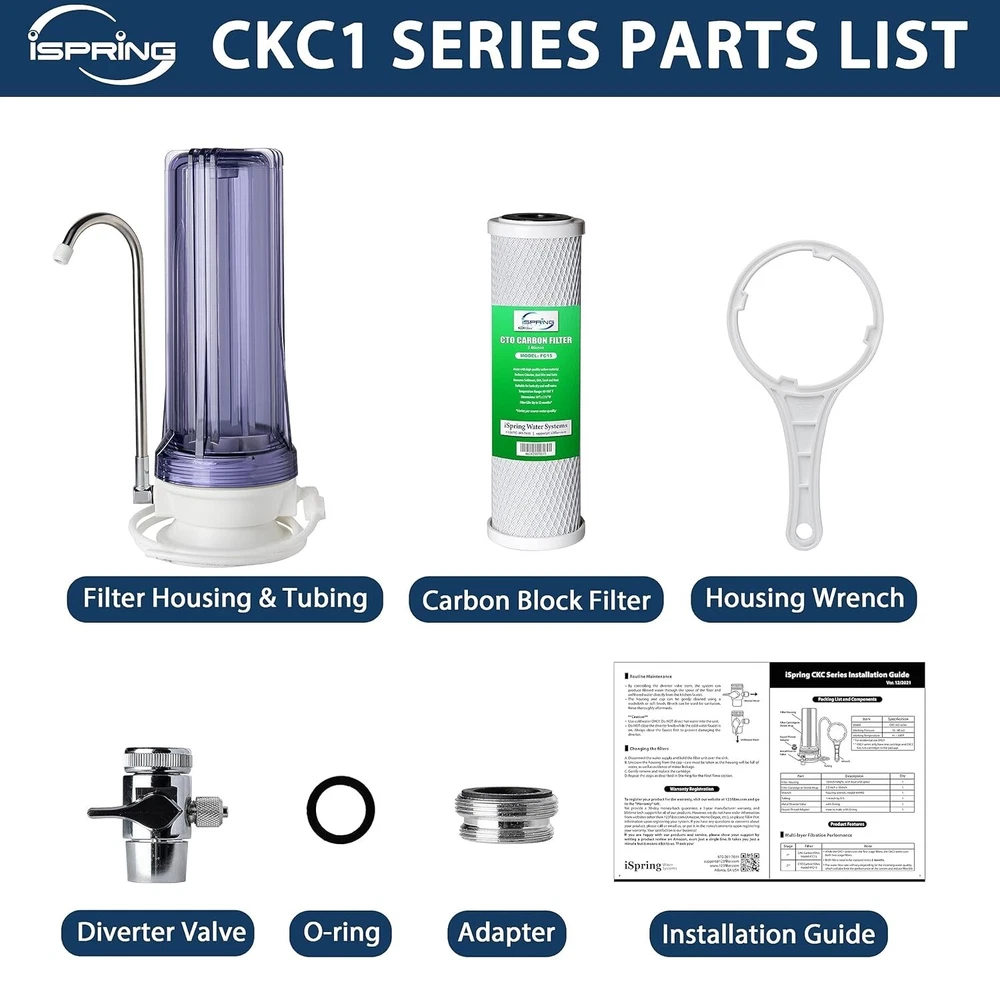 iSpring CKC1C Countertop Drinking Water Filtration System with Carbon Filter, 2.5" x 10", Clear CLEAR HOUSING - See-through housing allows you to visually inspect the filter and know when it's time for a filter change. ULTRA SAFE - Includes a standard 5 micron Carbon Block Cartridge that removes 95% of chlorine, odors, sand, silt, sediment and rust from your drinking water. Tested by independent third-party to meet NSF/ANSI Standards. EASY INSTALLATION - No drilling required. Portable and easy to install. Sleek and efficient design offers a natural look on any counter. Perfect for small spaces. COMPLETE FILTRATION - A standard 10 inch CTO cartridge, a plastic wrench, two faucet adapters, tubing and O-ring included for a leak-free install. TOP-NOTCH SUPPORT - 30 day money back guarantee, 1 year limited warranty and lifetime technical support from Atlanta, Georgia. LOW MAINTENANCE - It is recommended to replace the filters (FC15) every 6 months. PLEASE NOTE - Unlike an RO membrane, this countertop water filtration system DOES NOT reduce Total Dissolved Solids (TDS). Instead this filter keeps healthy minerals in your water while removing harmful chemicals. If you are interested in a filter that removes TDS, please consider our iSpring tankless under sink Reverse Osmosis (RO) system RO500 or countertop RO water filter system RCT600.