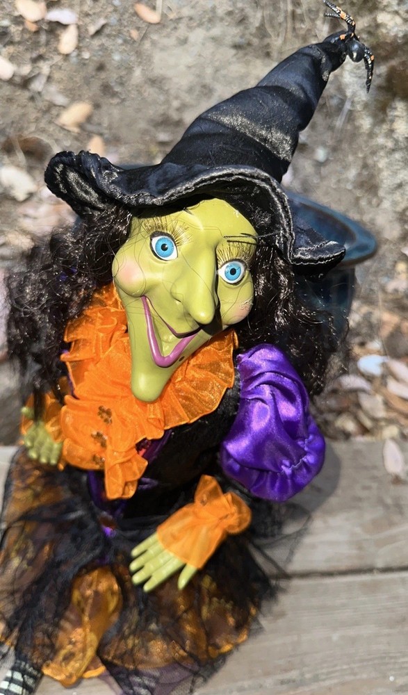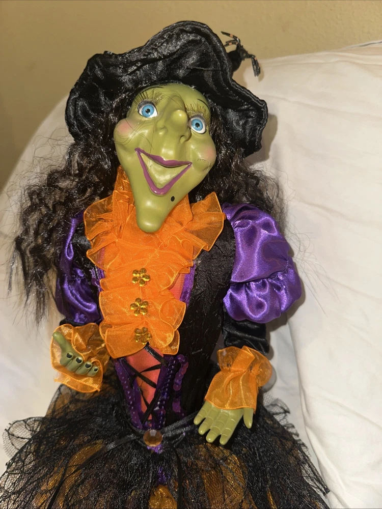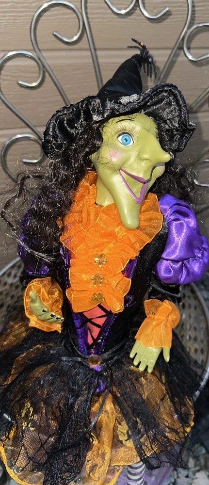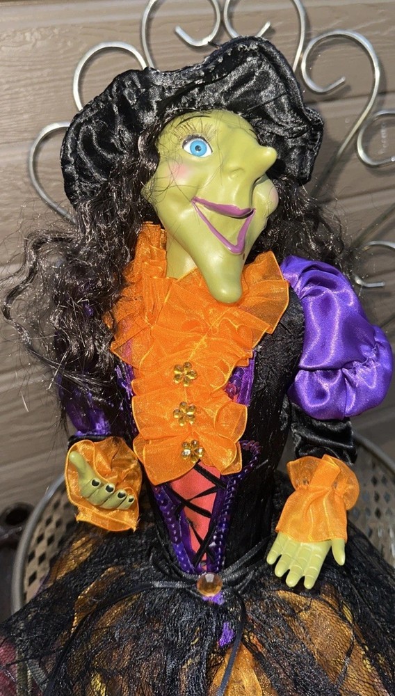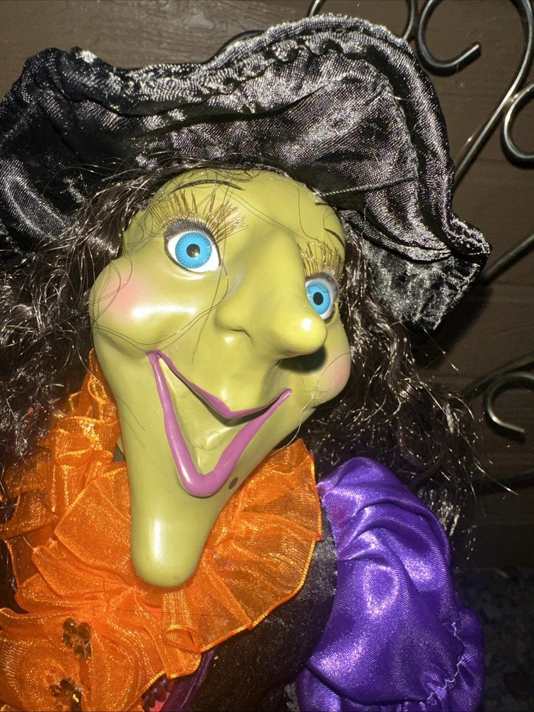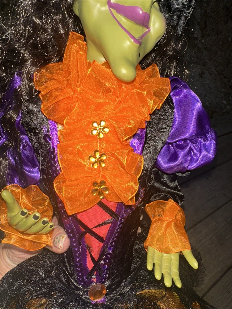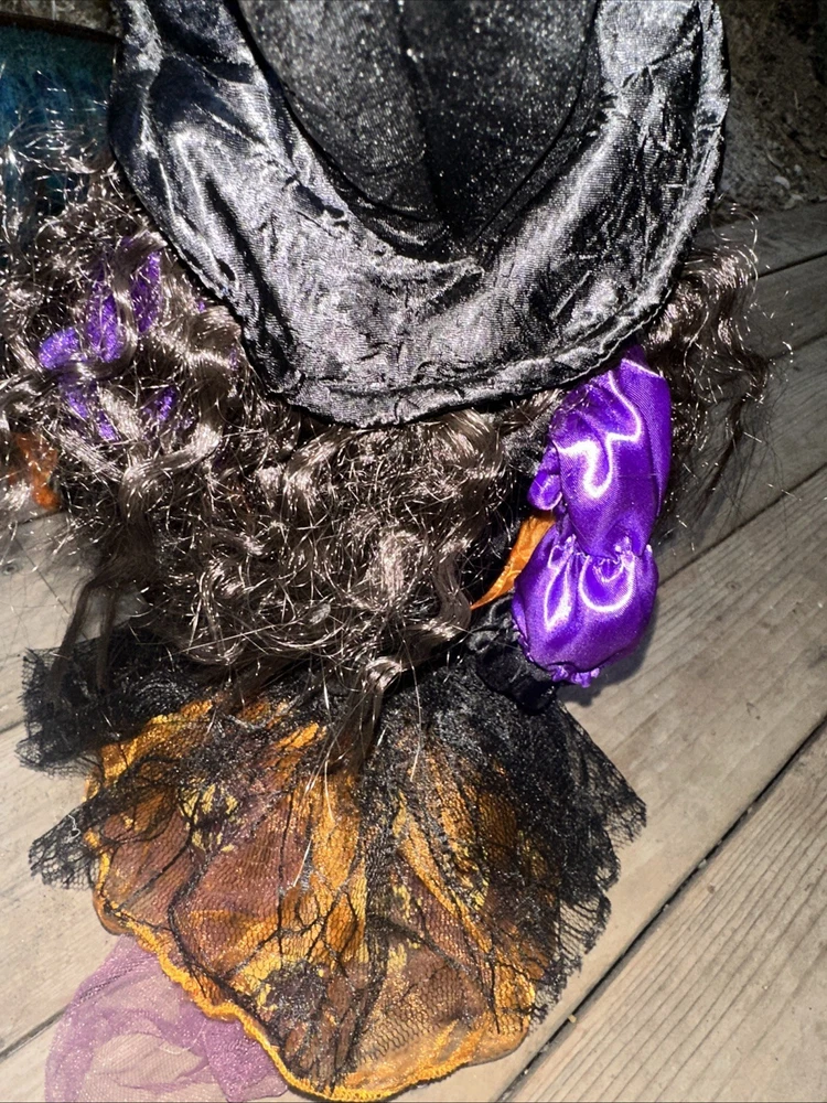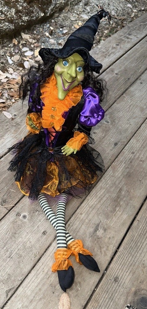 Sitting Halloween Green Gal Pal Witch 16Hx12"LEGS Folk Art - Orange/Black Adorable Halloween sitting witch with a green face. She wears orange ruffle dress with purple and black colors. Please see pictures Thank you for looking π