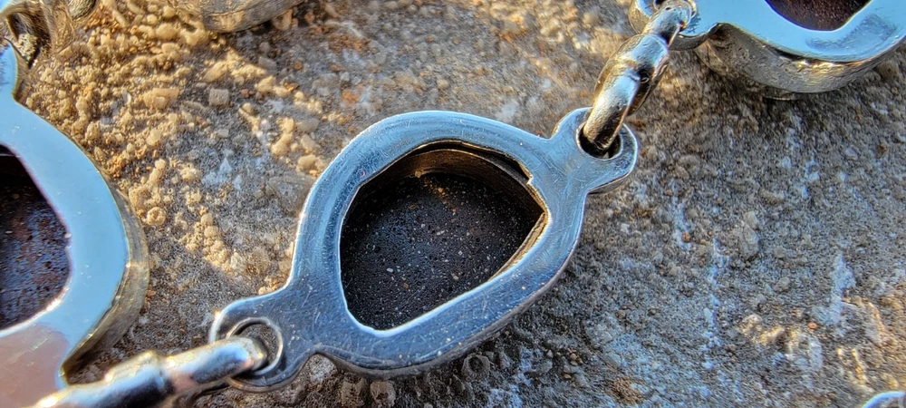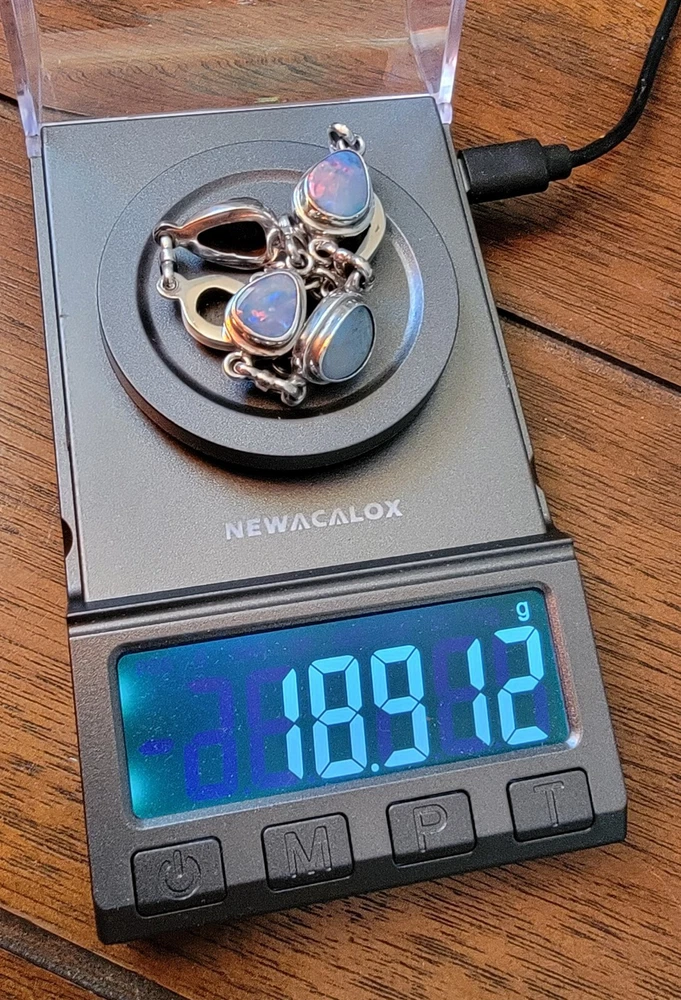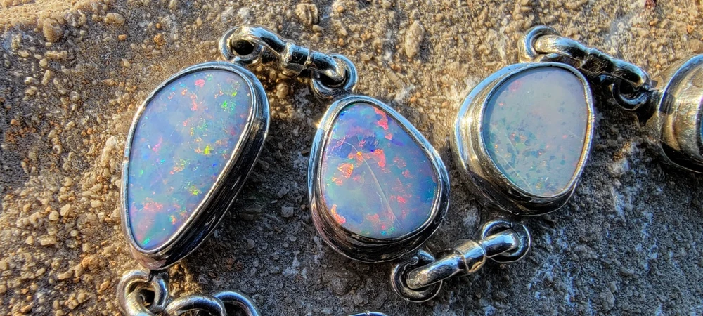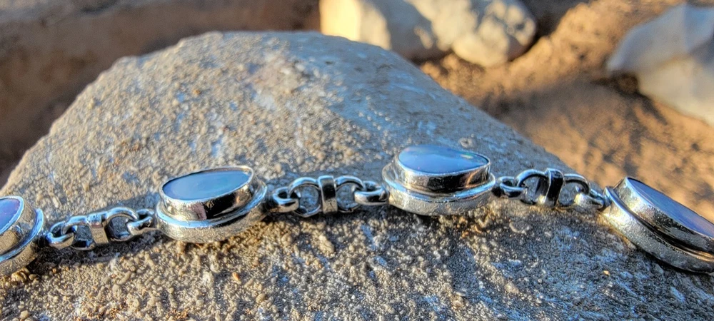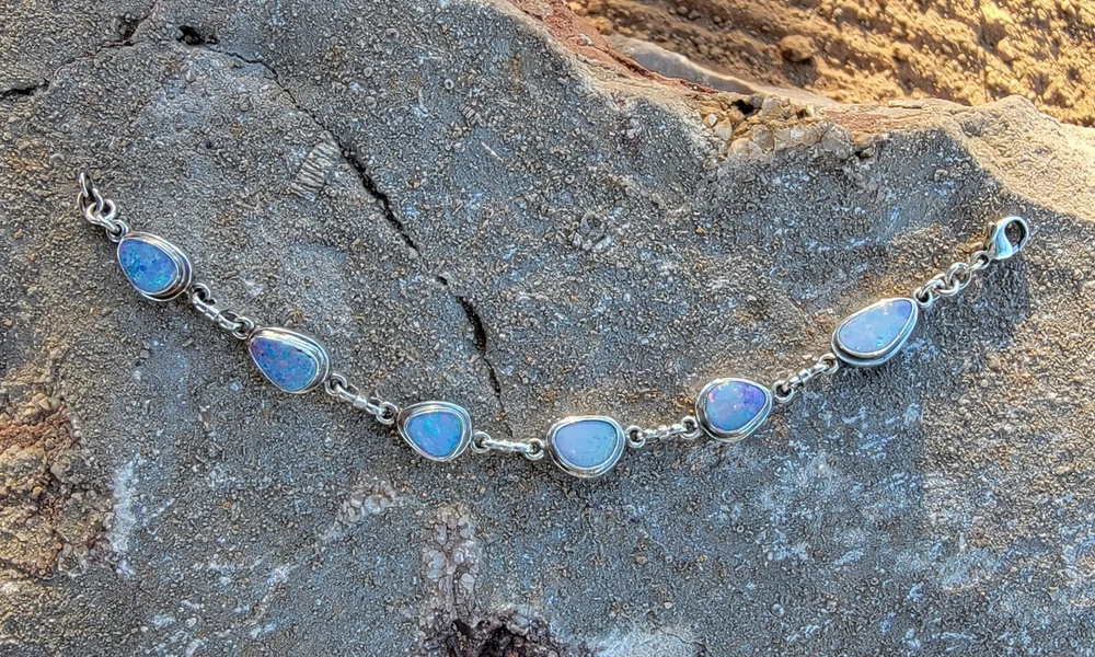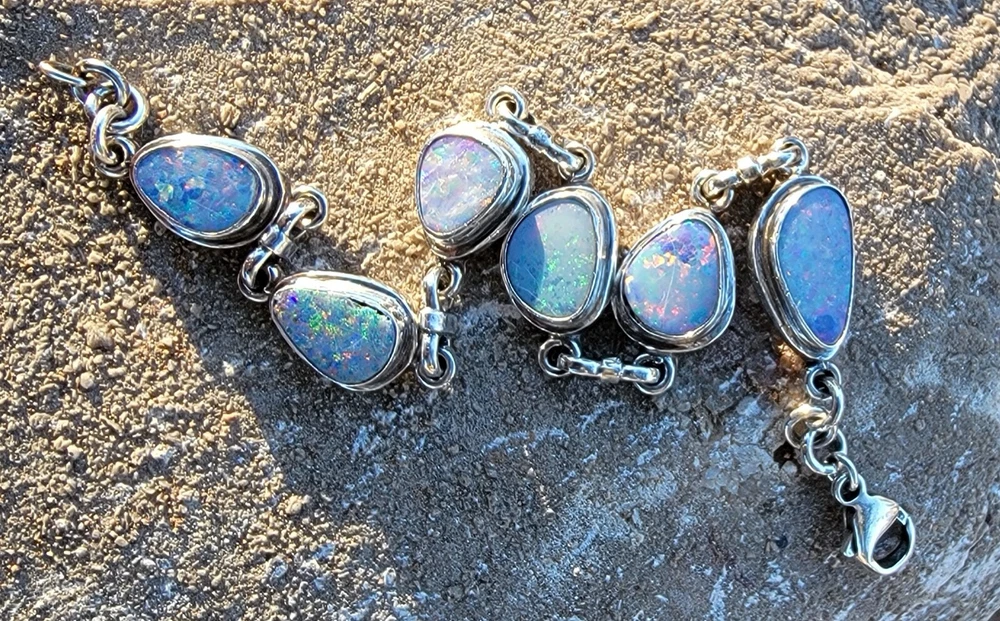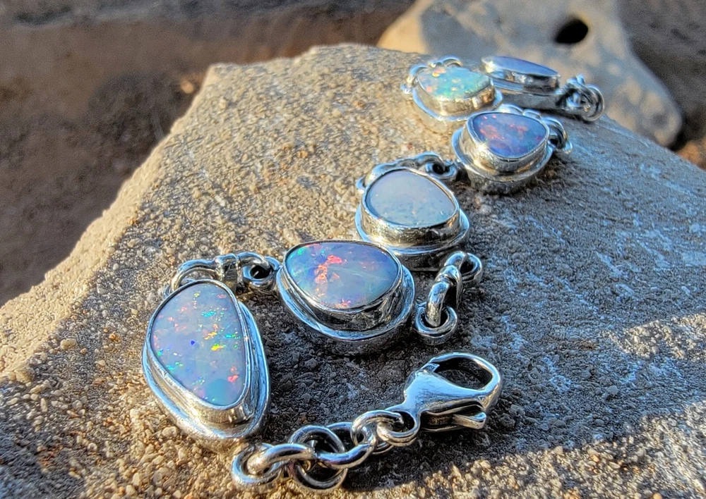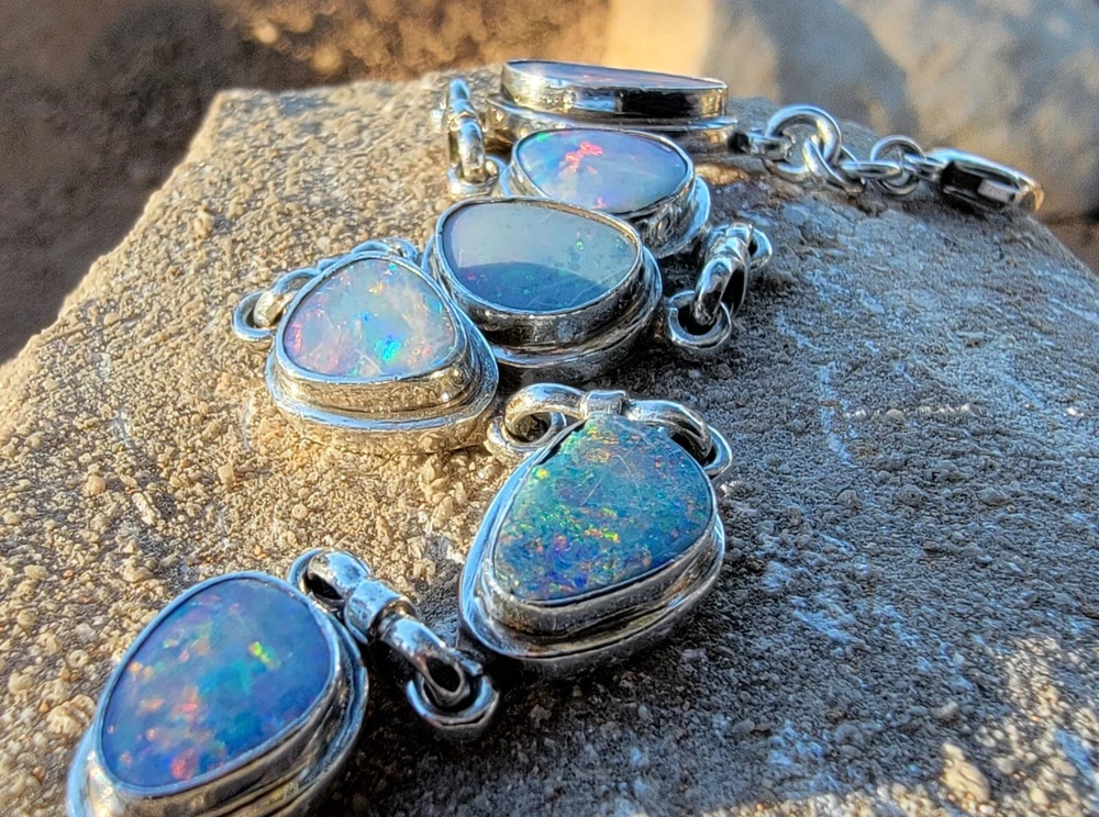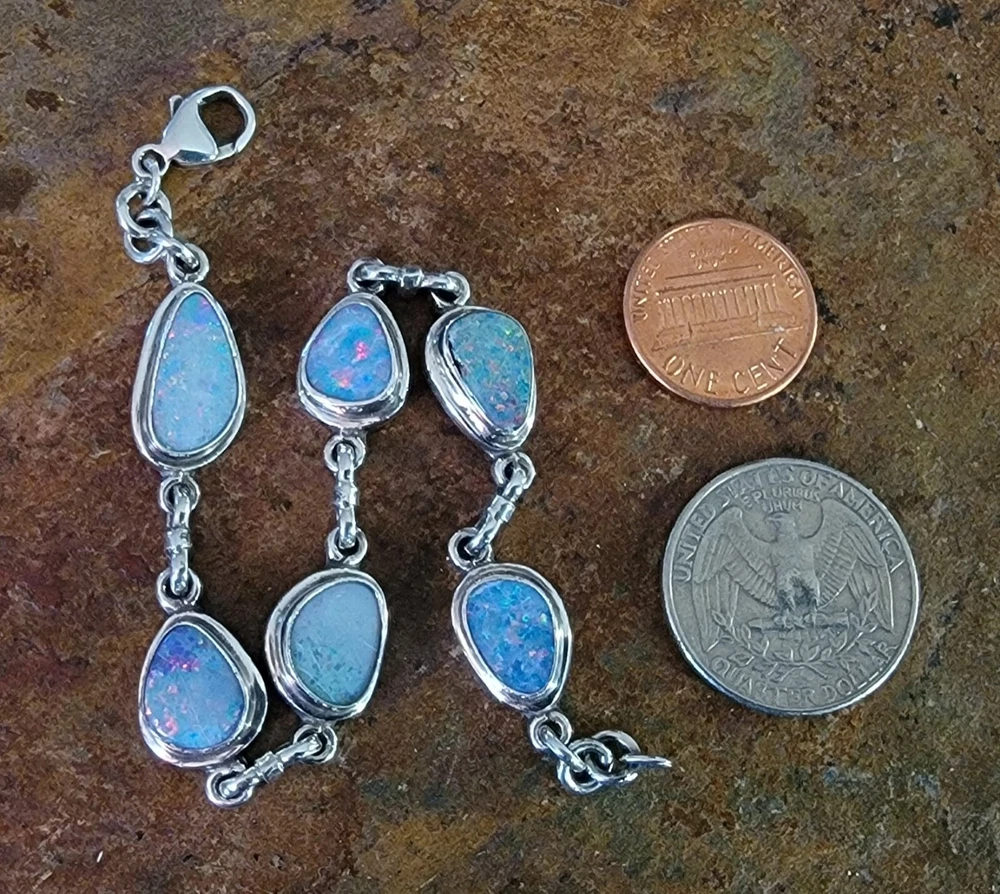 This bracelet features six assymetrical Australian Opal Doublets set in .925 solid Sterling Silver bezels. Each asymmetrical, natural doublet opals showcases a multicolor display, creating a unique and eye-catching piece. The bracelet is adjustable and has a secure lobster closure measuring a length of 7.5 inches. Details/ Dimentions: Six (6) total doublet assymetrical shaped Australian opals, Bezel setting (approx 1/4 5k 1/3 in diam, 4 mm thickness .925 Sterling Silver (unmarked) Links between opals measure 9.5 mm x 5mm x 1.25 mm Every link in the chain is silver soldered (securely closed) Total weight 18.9 grams Made in Australia (unmarked)